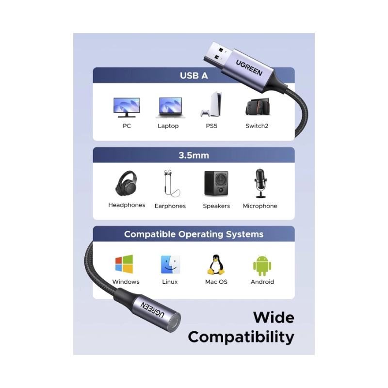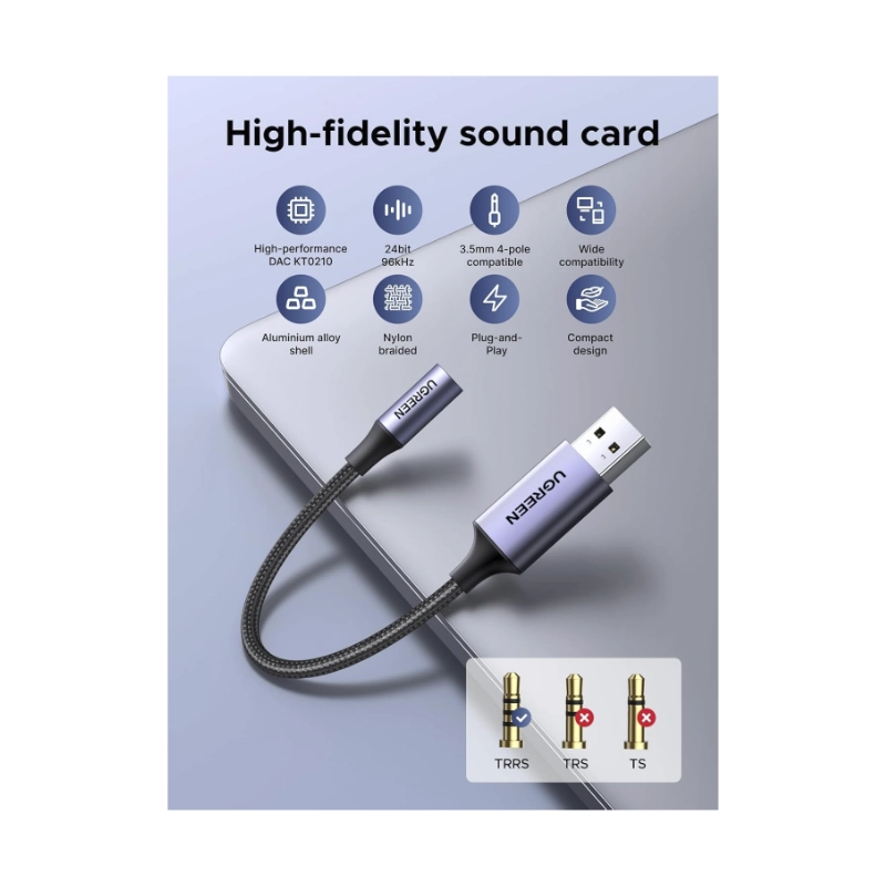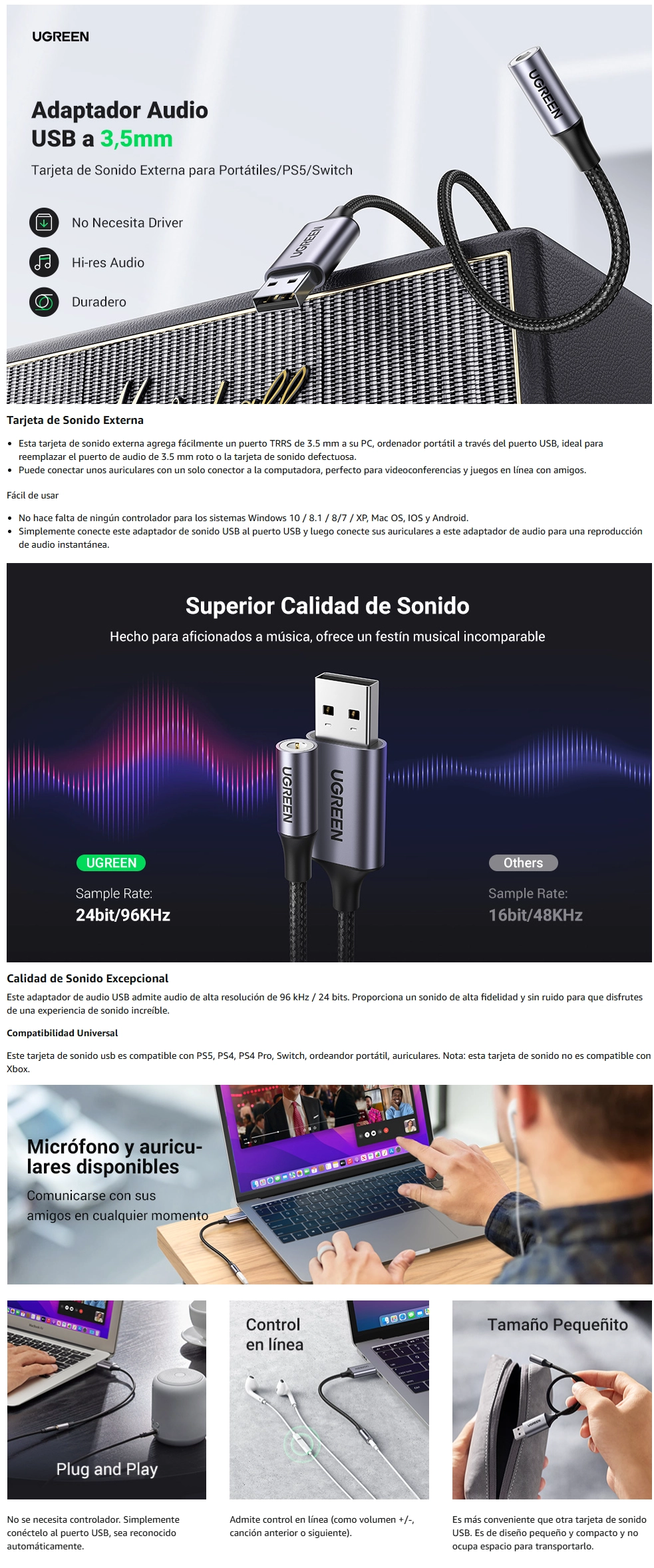 - Adaptador Usb A Audio 3.5Mm Ugreen (30757) Cable 25Cm, Soporte Para Microfono Trrs, Cable Trenzado