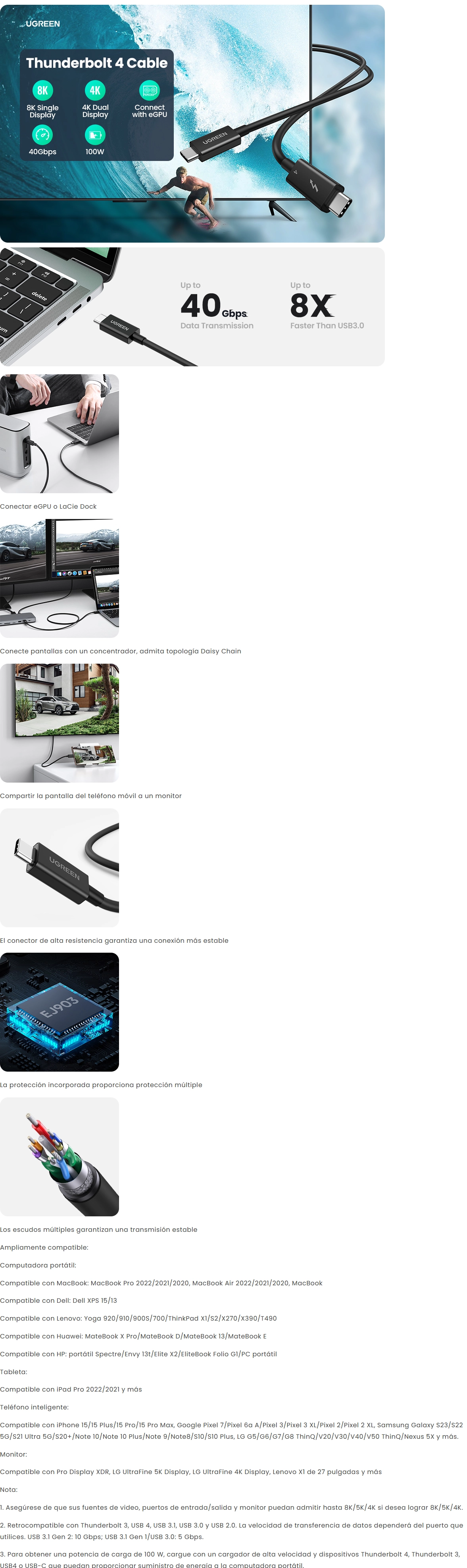 - Cable Thunderbolt 4 Usb-C A Usb-C Ugreen Us501 (30389) Negro Carga Rapida De 100 W, Soporte De Video Hasta 8K 60Hz, 0.8 Metros