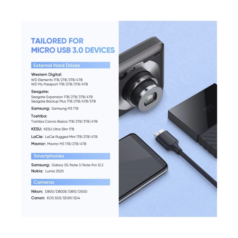 El cable UGREEN USB-C a USB 3.0 Micro-B está diseñado para conectar sus viejos discos duros externos USB 3.0 con nuevos ordenadores portátiles/escritorios/tablets directamente, lo cual es una forma sencilla de conectar un SSD USB 3.0 a su portátil para ampliar el almacenamiento, copia de seguridad de archivos o edición de documentos. Trabaje fuera de la caja y no solicite instalación de controladores.