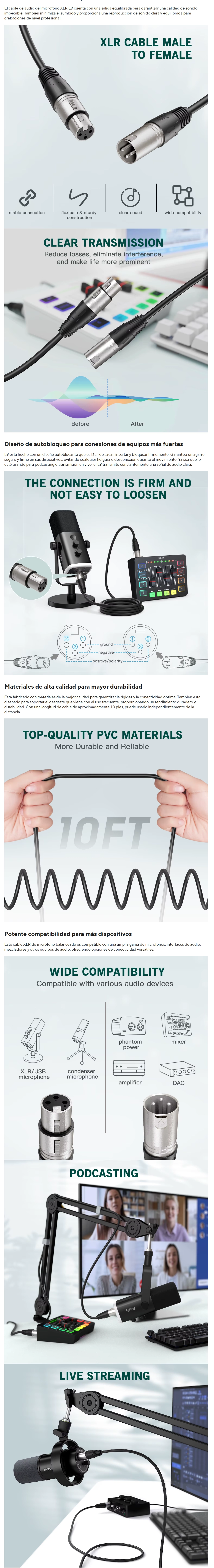 - Cable Xlr De 3 Pines Fifine (L9) Macho A Hembra, Negro, 3 Metros