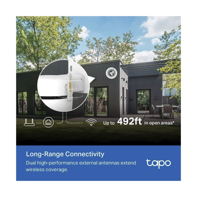 Conectividad Ininterrumpida de Largo AlcanceLas antenas externas de alto rendimiento extienden la cobertura inalámbrica hasta 150 m en áreas abiertas.* También puedes conectar tu cámara a la red a través del puerto Ethernet para una conexión estable. *Basado en pruebas de TP-Link en áreas abiertas, la experiencia real puede variar. |