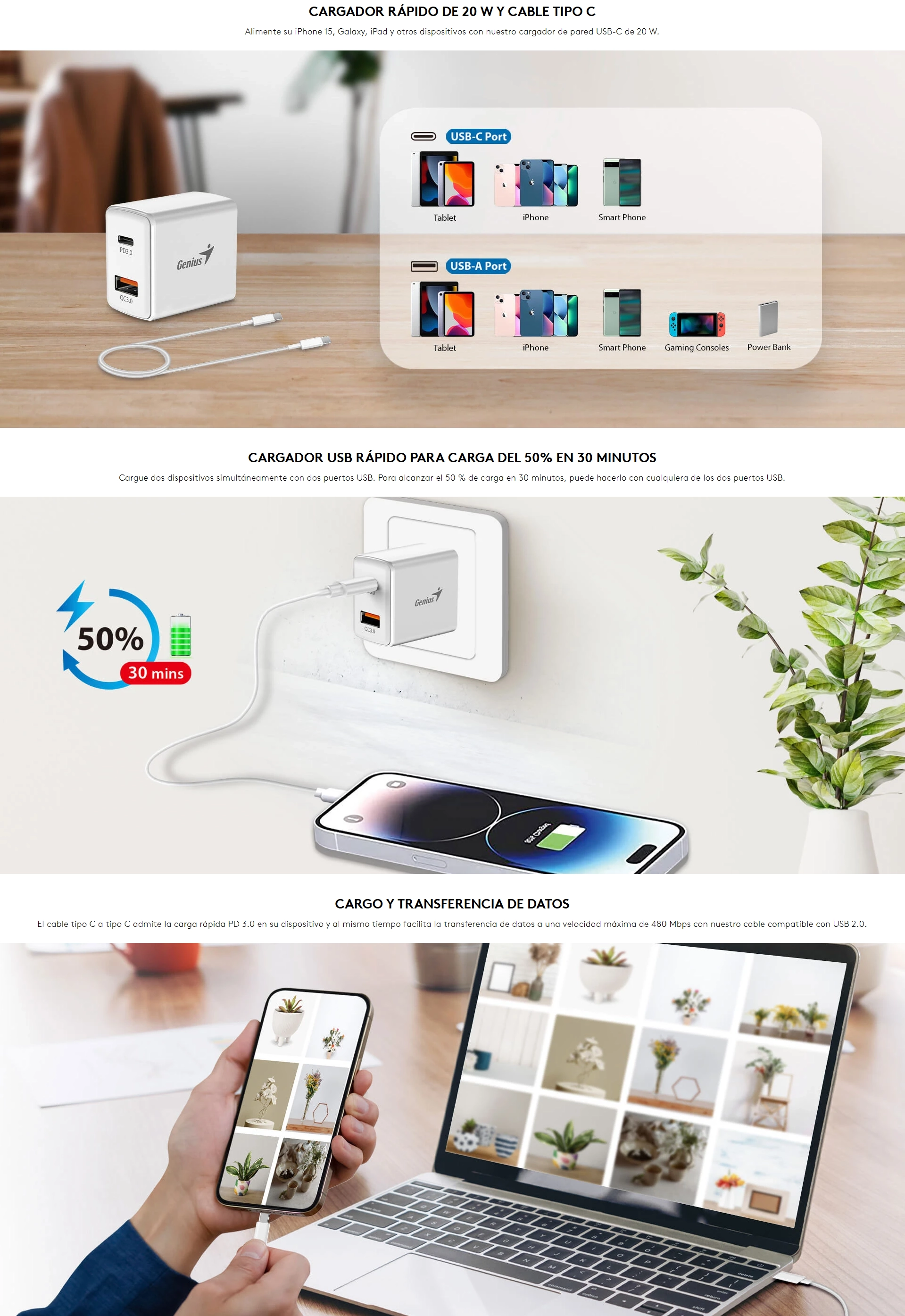 - Cargador De Pared Genius Pd-20Acp (32590009400) X1 Usb-C, X1 Usb-A, 20W, Con Cable Usb-C A Usb-C 3A, Blanco