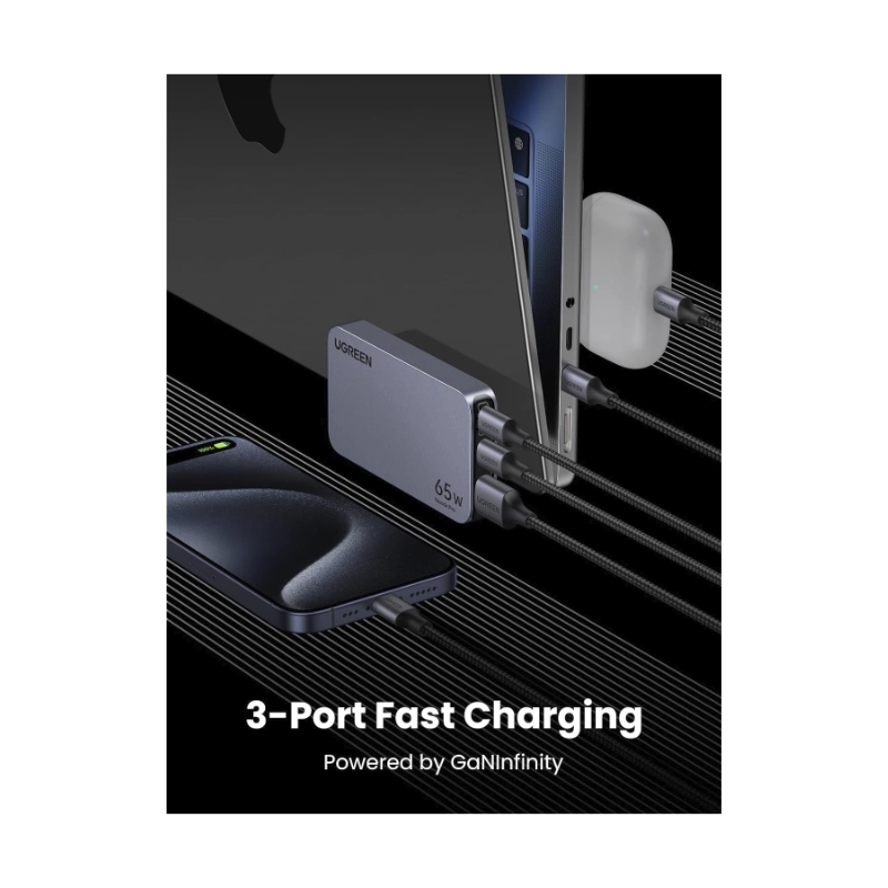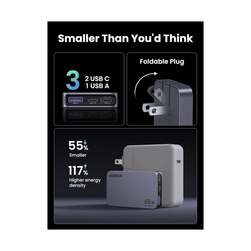 Cargador De Pared Ugreen Nexode Pro X753 (15817) X2 Usb-C, X1 Usb-A, 65W Carga Rapida, Slim Gan Compacto Y Rapido Pps, Para Iphone 16/15/14 Y Mas