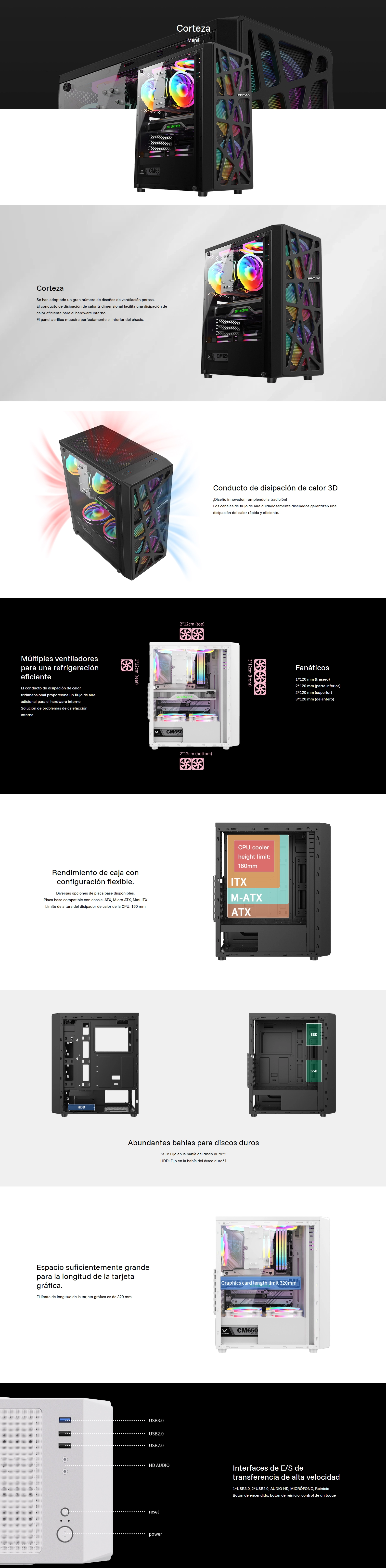 | Detalles | * FACTOR DE FORMA: MID TOWER ATX ORIENTACION VERTICAL * DIMENSIONES CON FRONTIS: LARGO 355MM ANCHO 180MM ALTO 425MM * SOPORTA PLACAS ATX (305mm x 244mm) MICRO ATX (244mm x 244mm) ITX (170mm x 170mm) * FUENTE DE PODER: NO * CONECTORES DE FUENTE: NO * SLOT DE EXPANSION: 4 * BOTONES: POWER * PUERTOS FRONTIS USB 1.0 x 1 USB 3.0 x 1 USB TYPE C x 1 AUDIO x 1 MICROFONO x 1 * CHASIS SISTEMA DE ENFRIAMIENTO LIQUIDO: SUPERIOR 120/240mm DELANTERO 120/240mm POSTERIOR 120mm * VENTILADORES INCLUYE: ESPACIO ADICIONAL: DELANTERO 2X120mm RAINBOW POSTERIOR 1x120mm * CONTENIDO ADICIONAL TORNILLOS 1 FILTRO DE POLVO INMANTADO (SUPERIOR) |