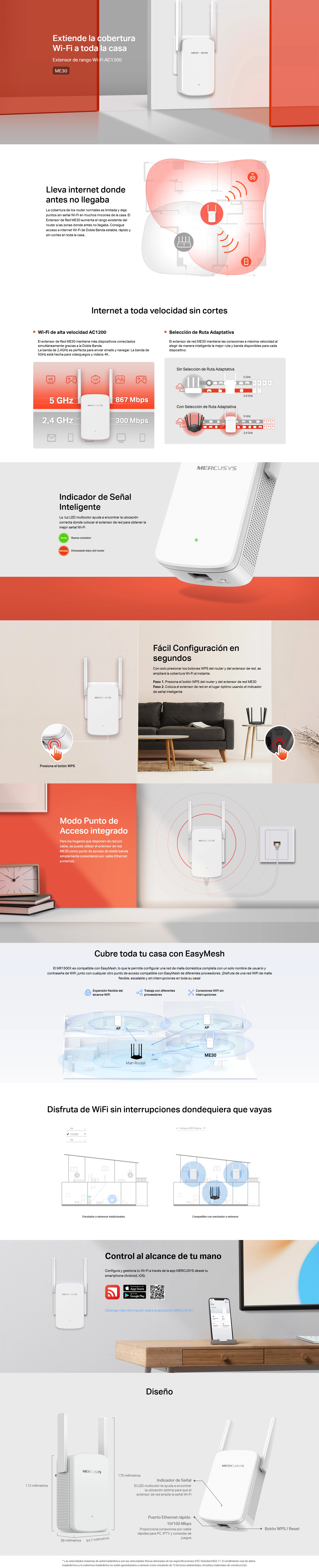 - Extensor De Rango Inalambrico De Pared Mercusys Ac1200 (Me30) 2.4Ghz/300Mbps, 5Ghz/867Mbps, Antena X2, Compatible Easymesh
