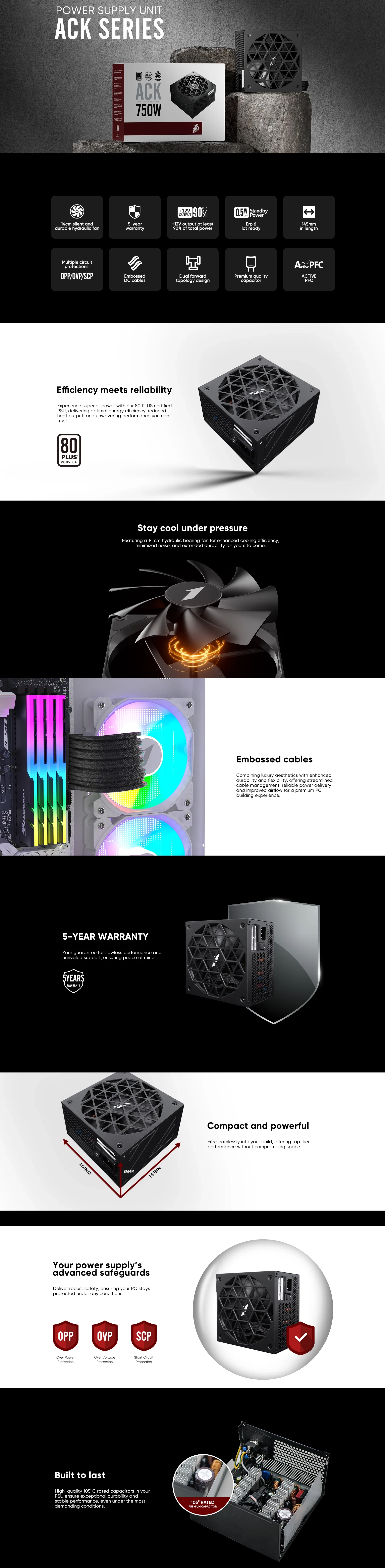 | Detalles | DIMENSIONES (L x An x Al): 145 x 150 x 86 mm MODULAR: No modular CERTIFICACIONES: 80 PLUS TENSIÓN DE ENTRADA: 200-240 V CORRIENTE DE ENTRADA: 6 A MÁX EFICIENCIA: 87,5 % con carga típica CAPACIDAD DE SALIDA: 650 W FRECUENCIA DE ENTRADA: 47-63 Hz / 47-63 Hz / 50-60 Hz PFC: PFC activo TAMAÑO DEL VENTILADOR: Cojinete hidráulico de 140 mm PROTECCIONES: OVP, OPP, SCP ESTRUCTURA DEL CIRCUITO: Topología de doble avance REGULADOR: EAC / CE / FCC / UKCA / RoHS |