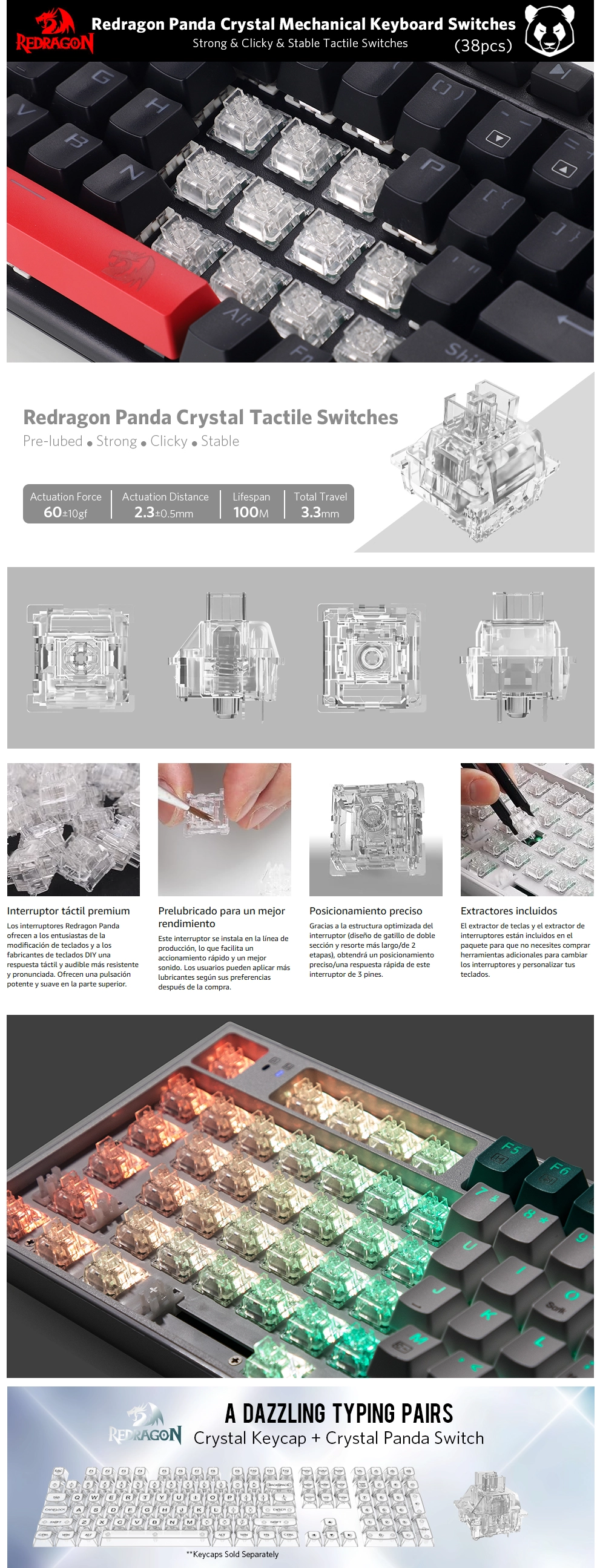 - Kit Switches Redragon Panda Crystal (A113 Hp2) 38 Pcs, Interruptores Tactiles Lubricados Transparentes Para Teclado Diy, 3Pin 60Gf Rgb Mx, Extractor