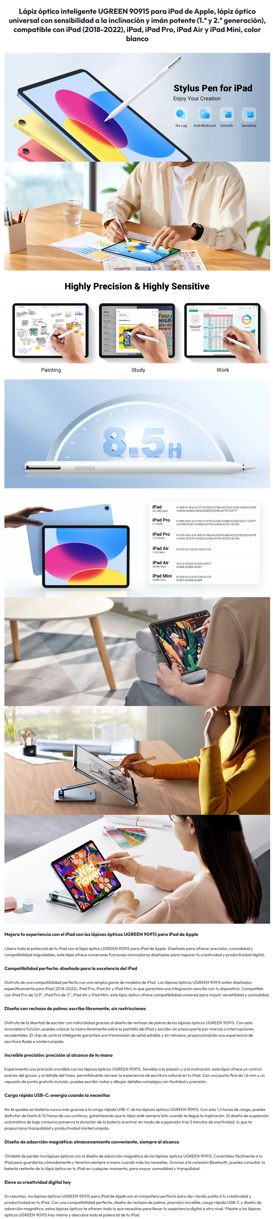 * Sensibilidad a la Inclinación: Ajusta el grosor de los trazos según el ángulo de inclinación del lápiz, ideal para sombreados y dibujo artístico. * Punta de Alta Precisión: Utiliza una punta de 1.6 mm fabricada en material POM para evitar daños en la pantalla y ofrecer una escritura fluida. * Acoplamiento Magnético: Se adhiere magnéticamente al lateral del iPad para un almacenamiento seguro, aunque este modelo específico se carga vía cable y no de forma inalámbrica por contacto. |