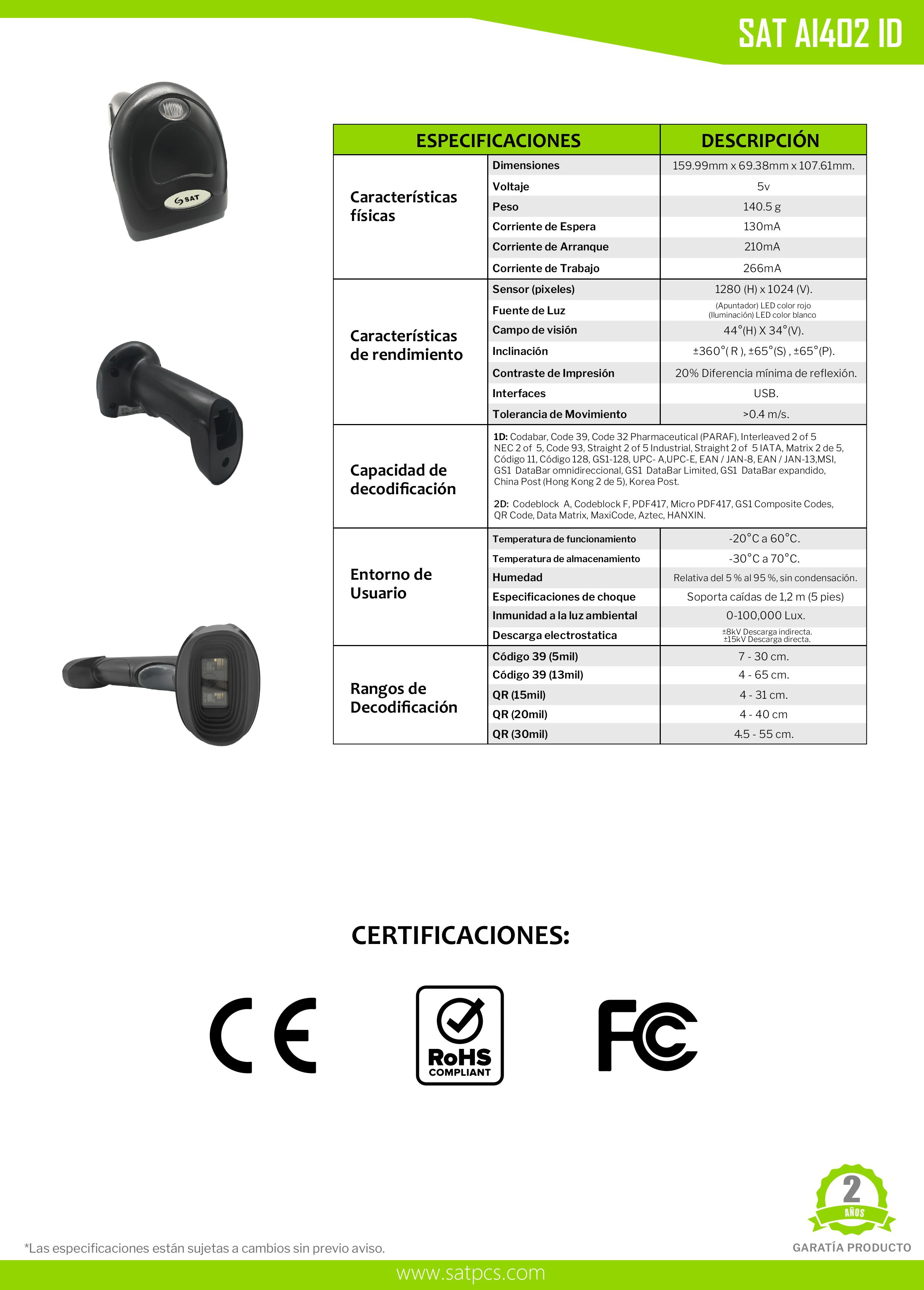 | Detalles | – Tecnología avanzada: Imager de área para un escaneo preciso y versátil. – Velocidad de escaneo: Hasta 270 lecturas por segundo para procesos ágiles. – Activación dual: Función manual y automática para mayor comodidad. – Capacidad de decodificación: Compatible con códigos 1D, 2D y OCR. – Interfaz de comunicación: Conexión USB para integración sencilla. – Rango de temperaturas: Funciona de -20°C a 60°C, con almacenamiento seguro de -30°C a 70°C. – Durabilidad: Resistente a caídas de hasta 1,2 metros. – Ángulo de lectura amplio: Horizontal de 44° y vertical de 34°. |