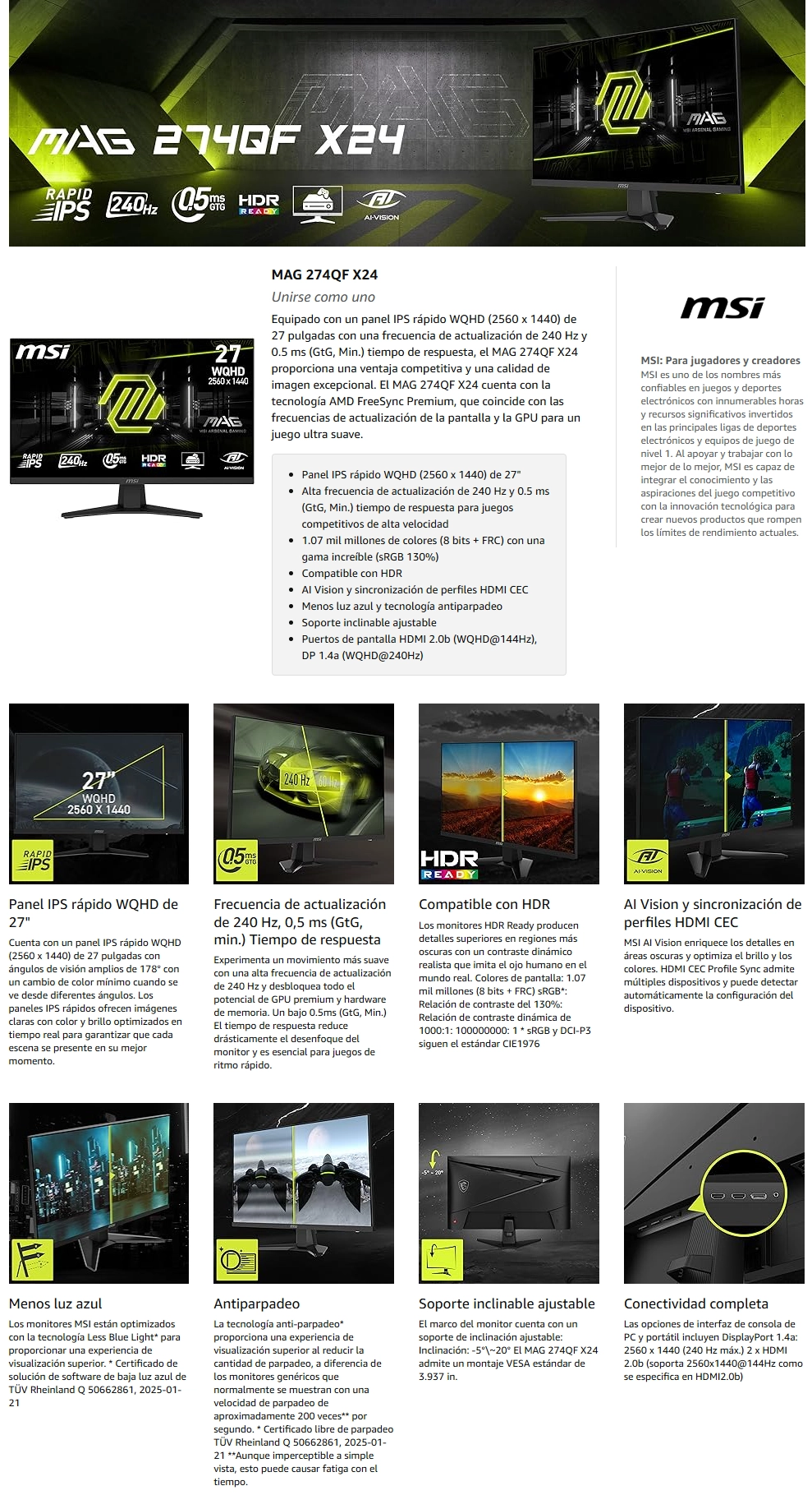 - Monitor Gaming Msi 27″ (Mag 274Qf X24) Fast Ips, Wqhd 2K, 2560 X 1440, 2 Hdmi/Dp, 0.3Ms, 240Hz, Sincronizacion Adaptativa, Ai Vision