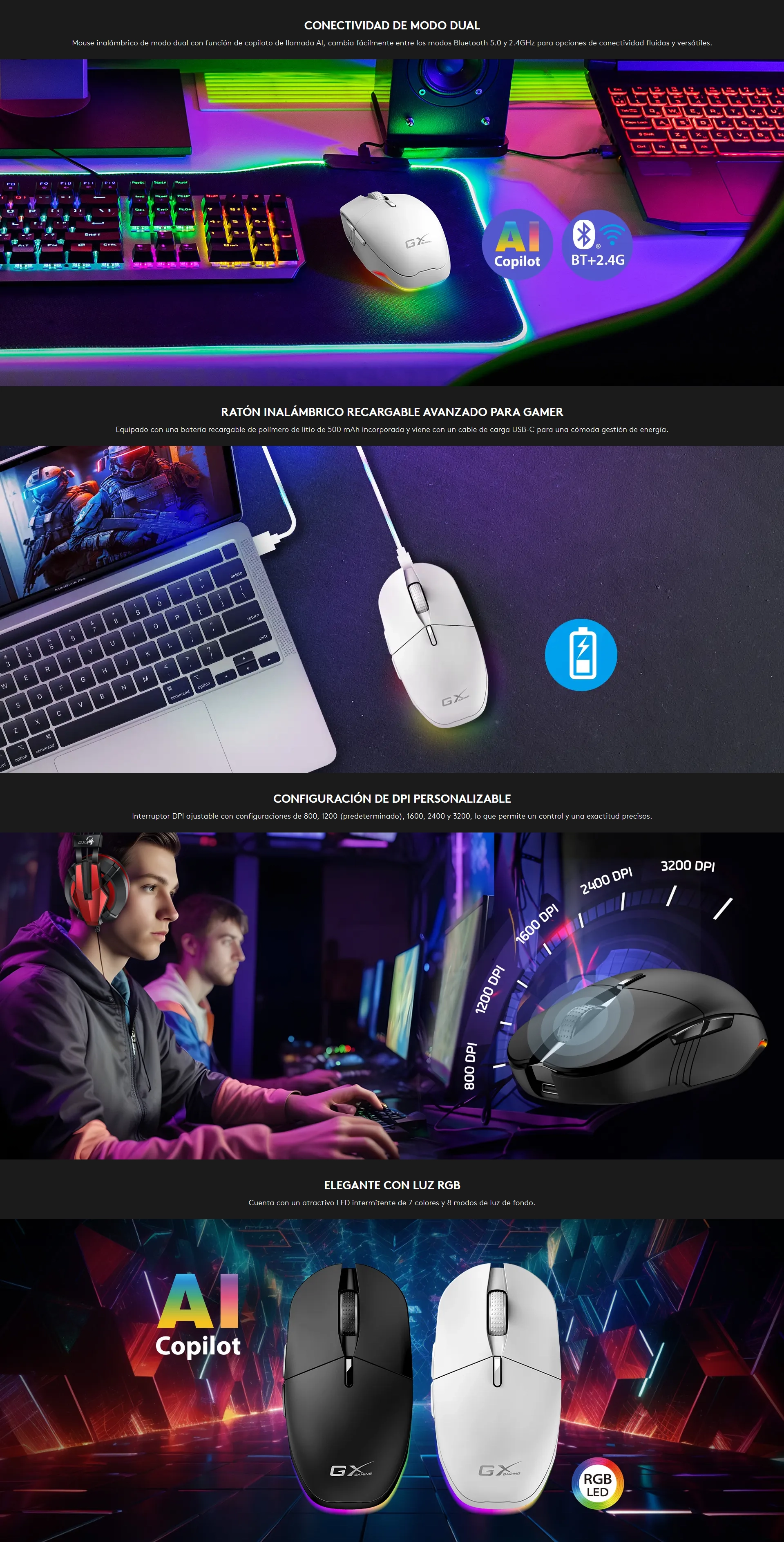 | Detalles | – Ratón inalámbrico para juegos Bluetooth recargable con LED – Cómodo, ideal para jugar, trabajar o llamar a AI Copilot – Opción de modo dual: Bluetooth 5.0 y 2.4GHz – Interruptor DPI 800/1200 (predeterminado) /1600/2400/3200 – 8 modos de iluminación con colores RGB – Ahorro de energía cuando no se utiliza – Batería recargable incorporada de 500 mAh – batería de polímero de litio – Cable de carga USB-C incluido – USB Plug and Play; fácil de empezar |
