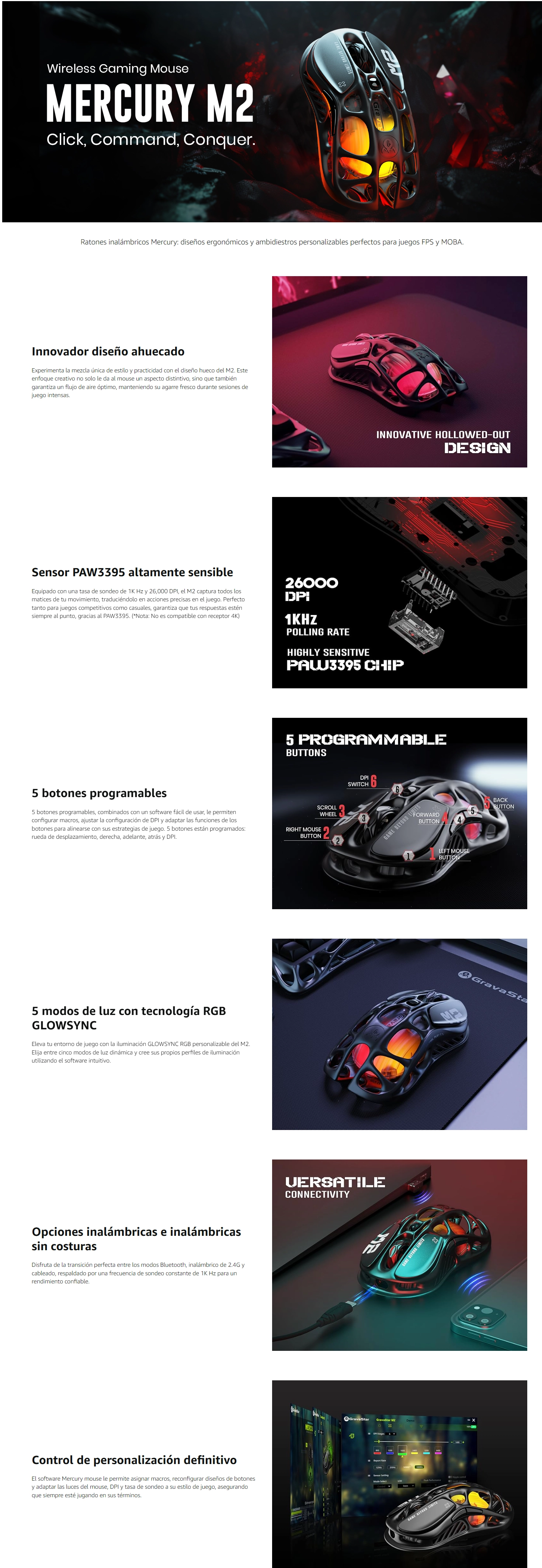- Mouse Inalambrico Gravastar Mercury M2 (Gravastar M2-Blk) Negro, 26000 Dpi, Sensor Paw3395Dm, Diseño Ligero Ahuecado De 2.79 Oz, 5 Botones Programable