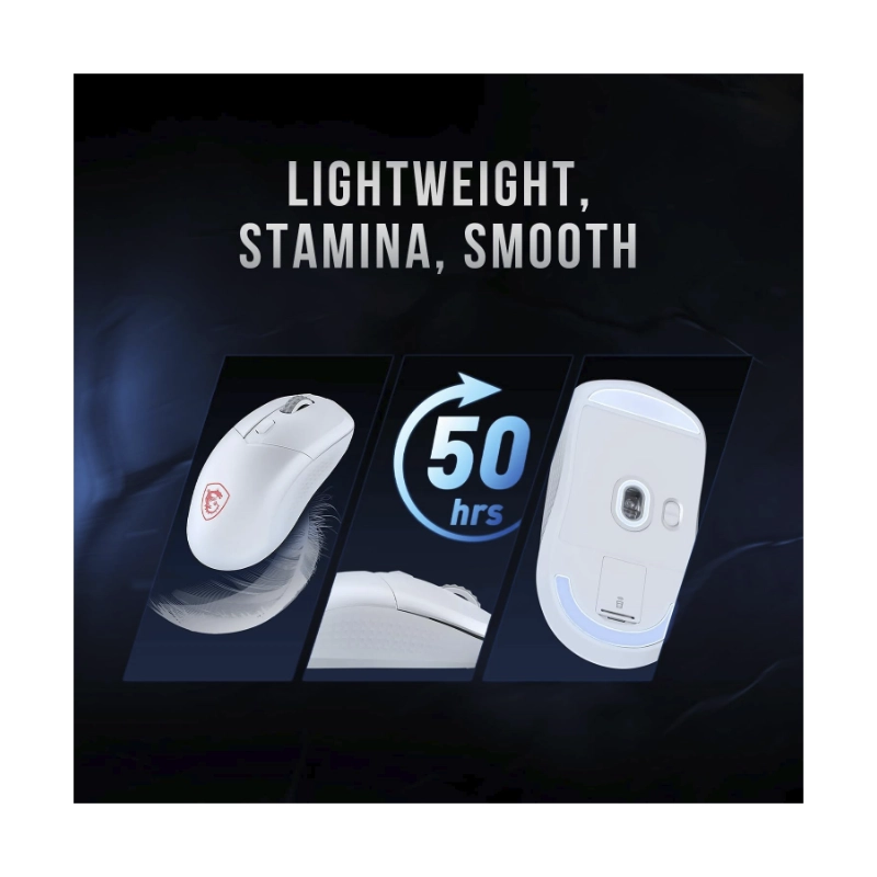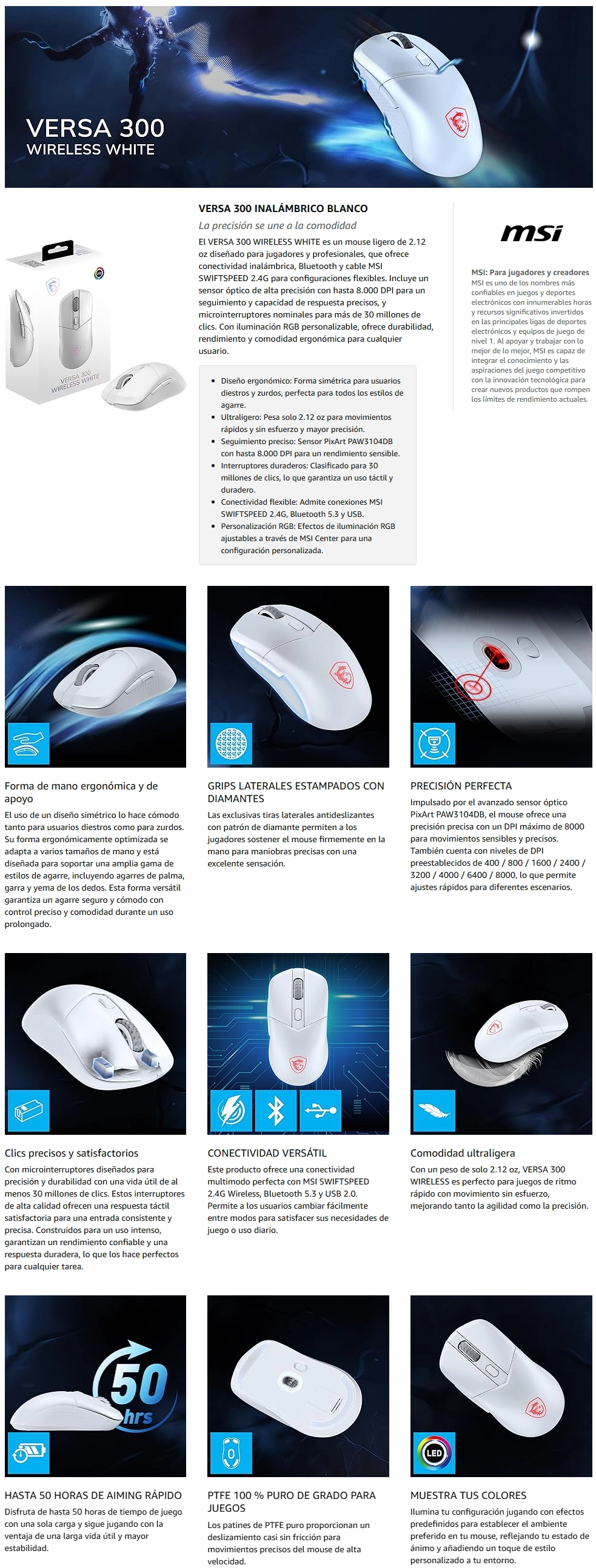 Mouse Inalambrico Msi (Versa 300 W White) Gaming, Blanco, 8000 Dpi, Interruptor Kailh De 30M+ Clics, Luz Rgb