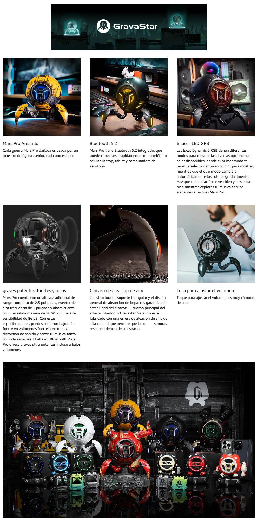 Parlante Portatil Gravastar Mars Pro (G1 Pro_blk_v2) Robotico, 20W, Negro Mate, Sonido Estereo, Graves Profundos, Bluetooth, 15H De Reproduccion, Rgb