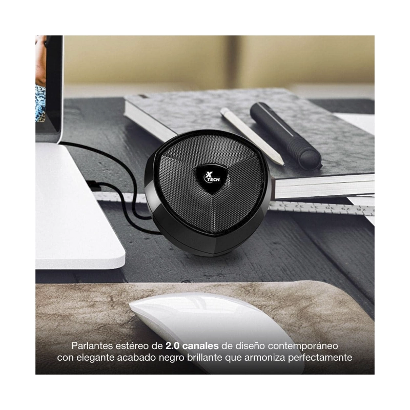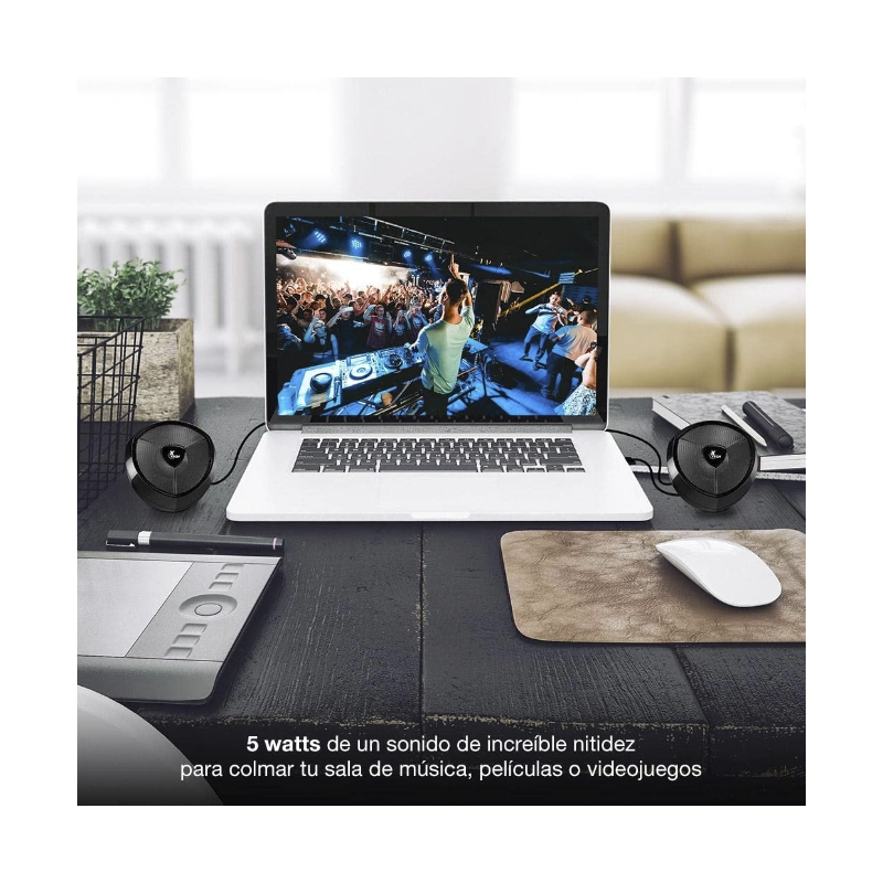 – 5 watts de un sonido de increíble nitidez para colmar tu sala de música, películas o videojuegos – Conveniente perilla para el control del volumen ubicada al frente para ajustar la intensidad del sonido de la computadora, reproductores de DVD, CD o audio digital |