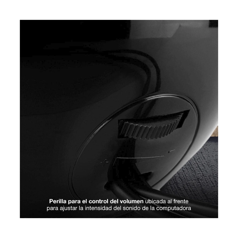 Conveniente perilla para el control del volumen ubicada al frente para ajustar la intensidad del sonido de la computadora, reproductores de DVD, CD o audio digital |