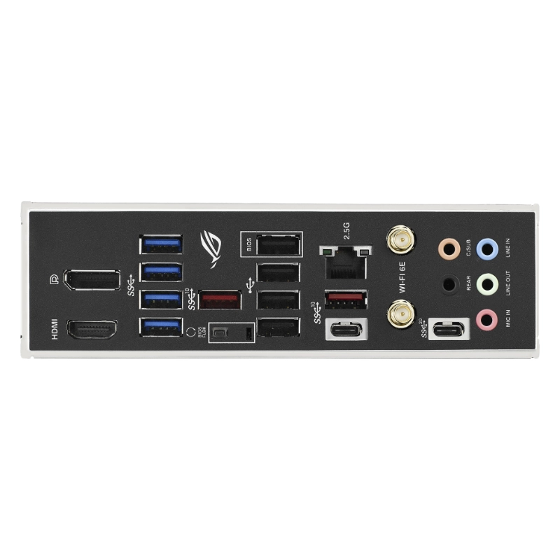 | Puertos de E/S posteriores | 1 puerto USB 3.2 Gen 2×2 (1 USB tipo C) 3 puertos USB 3.2 Gen 2 (2 tipo A + 1 USB tipo C) 4 puertos USB 3.2 Gen 1 (4 tipo A) 4 puertos USB 2.0 (4 tipo A) 1 DisplayPort 1 puerto HDMI 1 módulo Wi-Fi 1 puerto Ethernet Intel I225-V de 2,5 Gb 5 conectores de audio 1 botón BIOS FlashBack |