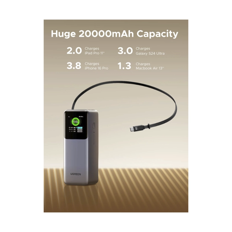Power Bank Ugreen Pb726 (55987B) Nexode, Cable Retractil Integrado, Pantalla Inteligente Tft, Carga Rapida De 165 W, 20000Mah