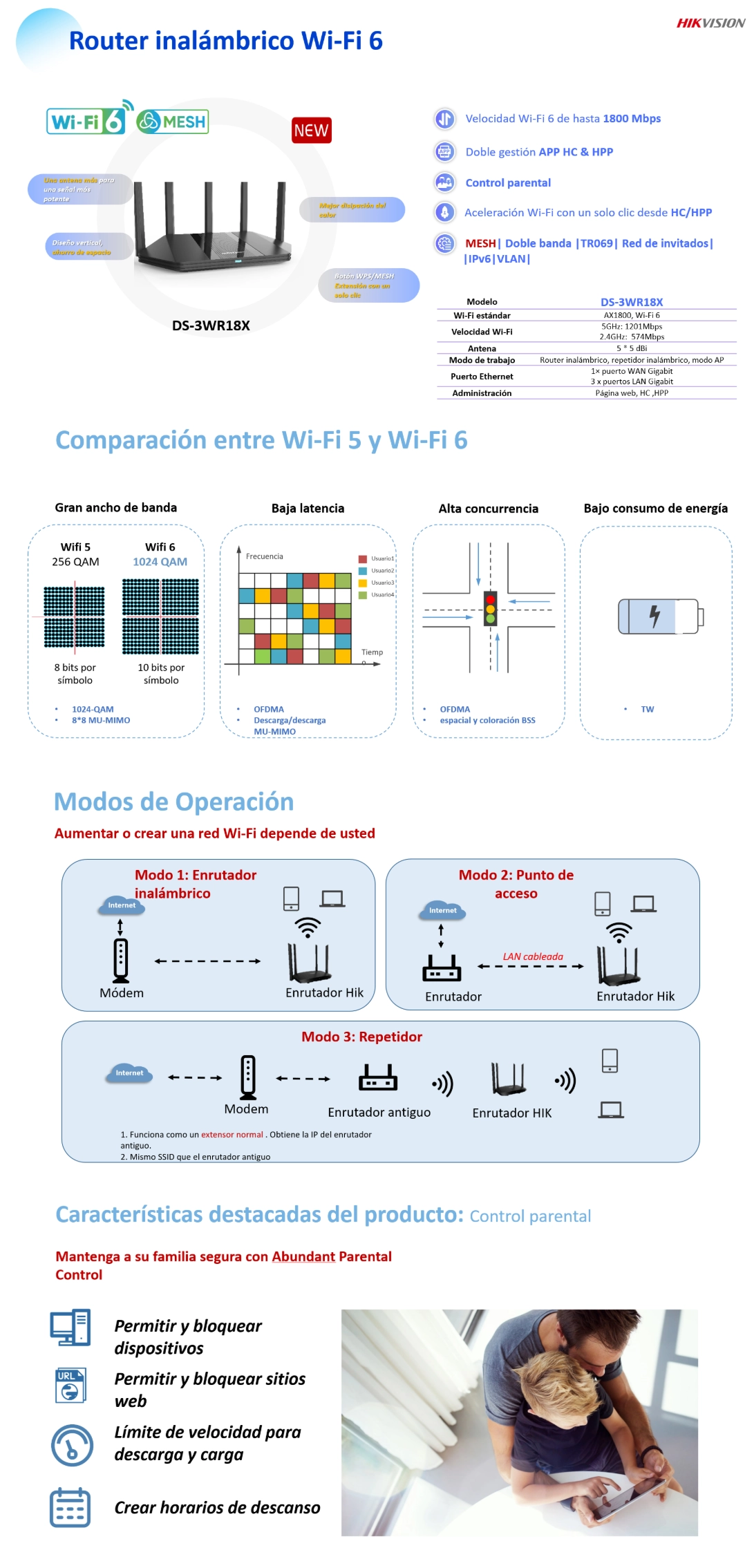 - Router Inalambrico Hikvision Ax1800 (Ds-3Wr18X) Wifi 6, 2.4Ghz/574Mbps, 5Ghz/1201Mbps, Antena X5, Port X3 Lan + Port X1 Wan 10/100/1000Mbs