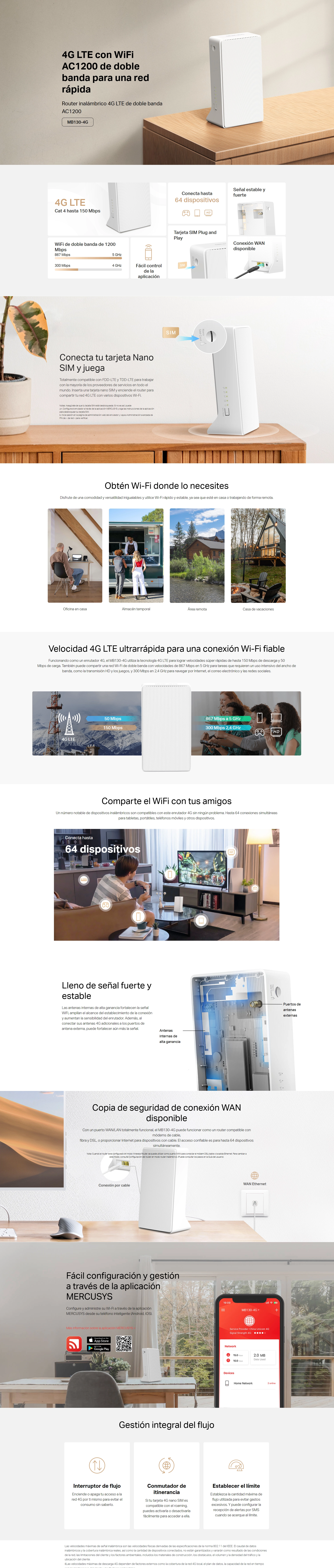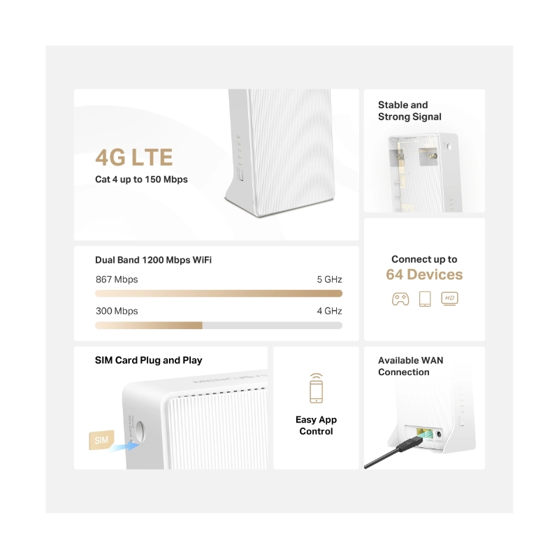 - Router Inalambrico Mercusys 4G Lte (Mb130-4G) X1 Ranura Sim, 2.4Ghz/300Mbps, 5Ghz/867Mbps, Port X1 Wan + X1 Lan 100Mbps, Conecta Hasta 64 Dispositivos