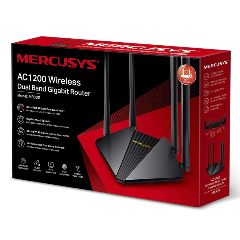 Router Inalambrico Mercusys Ac1200 (Mr30G) 2.4Ghz/300Mbps, 5Ghz/867Mbps, Antena X4, Port X2 Lan 10/100/1000Mbps, Port X1 Wan 10/100/1000Mbps