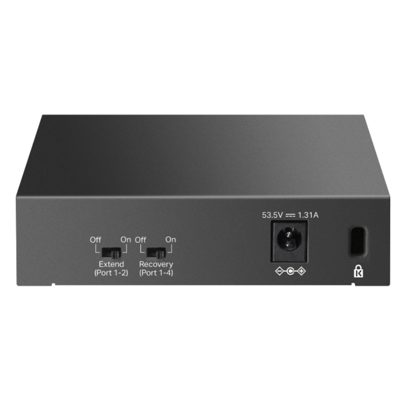| CARACTERÍSTICAS DE SOFTWARE | – Características Avanzadas: • Botón de modo extendido (puertos 1-2, suministro de energía PoE y transmisión de datos de hasta 250 m) • Botón de recuperación automática PoE (puertos 1-4) • Compatible con PD compatibles con IEEE 802.3af/at • Aprendizaje automático de direcciones MAC y envejecimiento automático • Control de flujo IEEE 802.3x • QoS 802.1p/DSCP • Inspección IGMP • Tecnología ecológica – Método de Transmisión: Almacenar y reenviar |