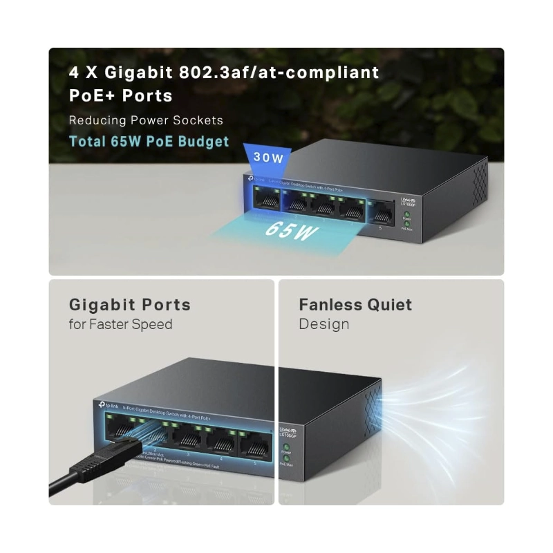 - Switch Tp-Link 5 Puertos Con Poe+ (Ls105Gp) 10/100/1000Mbps, 250 Metros, Alimentan Facilmente Dispositivos Como Camaras Ip, Carcasa Metalica