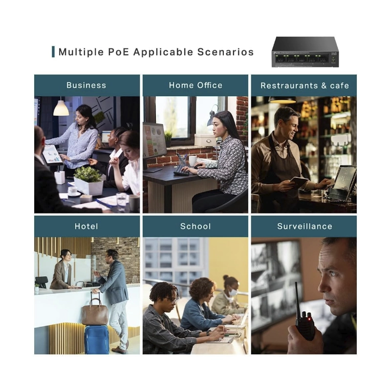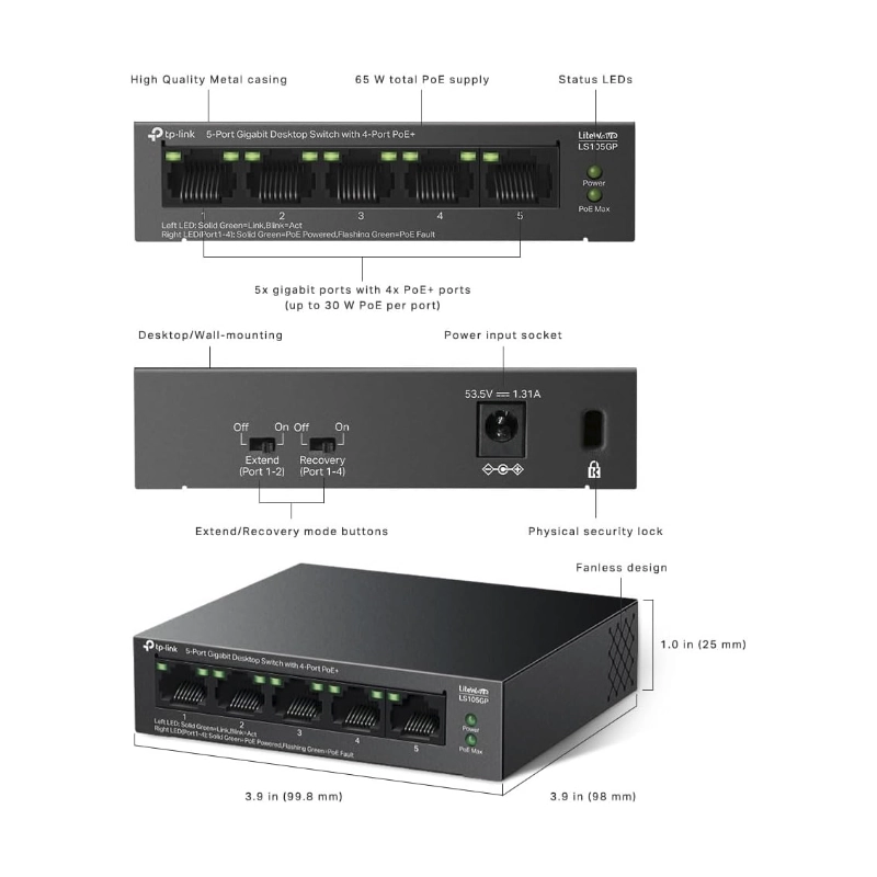 | CARACTERÍSTICAS DE HARDWARE | – Interfaz: • 5 puertos RJ45 de 10/100/1000 Mbps (los puertos 1 a 4 admiten PoE+ 802.3af/at) • Negociación automática • MDI/MDIX automático – Medios de Red: • 10BASE-T: cable UTP de categorías 3, 4 y 5 (máximo 100 m); EIA/TIA-568 100 ? STP (máximo 100 m) • 100BASE-TX: cable UTP de categorías 5 y 5e (máximo 100 m); EIA/TIA-568 100 ? STP (máximo 100 m) • 1000BASE-T: cable UTP de categorías 5, 5e, 6 o superior (máximo 100 m); EIA/TIA-568 100 ? STP (máximo 100 m) – Cantidad de Ventiladores: Sin ventilador – Instalación: • Escritorio • Montaje en pared – Fuente de Alimentación: Adaptador de corriente externo (Salida: 53,5 VCC/1,31 A) – Puertos PoE (RJ45): • Estándar: compatible con 802.3 af/at • Puertos PoE: Puertos 1 a 4, hasta 30 W de salida PoE por puerto • Fuente de alimentación: 65 W – Dimensiones (W X D X H): 3,9 × 3,9 × 1,0 pulgadas (99,8 × 98 × 25 mm) – Consumo Máximo de energía: • 4 W (220/50 Hz. sin PD conectado) • 74,46 W (220/50 Hz. con PD de 65 W conectado) – Disipación Máxima de Calor: • 13,6 BTU/h (sin PD conectado) • 253,16 BTU/h (con PD de 65 W conectado) |