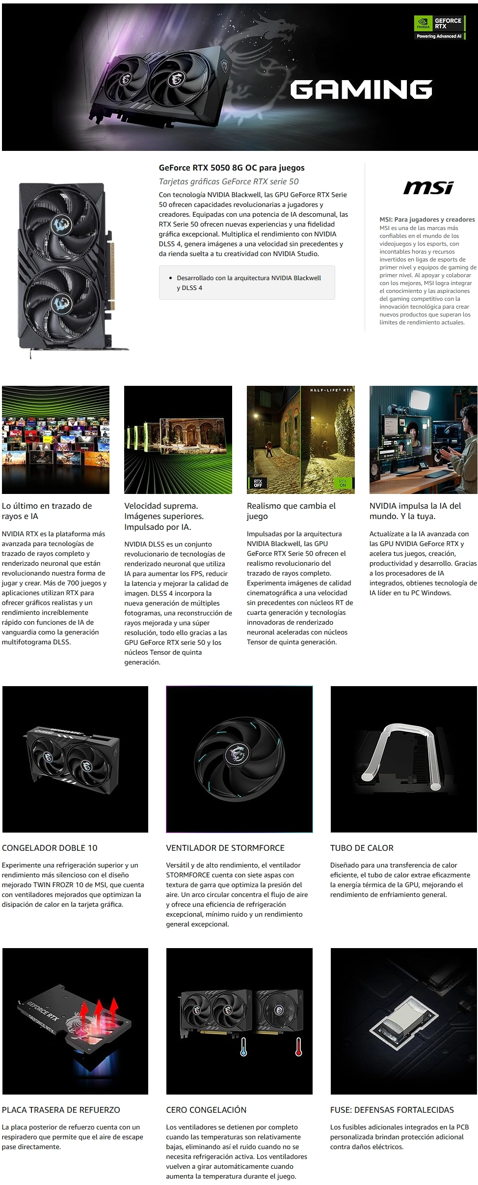 - Tarjeta Grafica Msi Geforce Rtx 5050 8Gb Gddr6 (Rtx 5050 8G Gaming Oc) 128 Bit, Pcie 5.0, Twin Frozr 10, 2 X Ventilador Stormforce