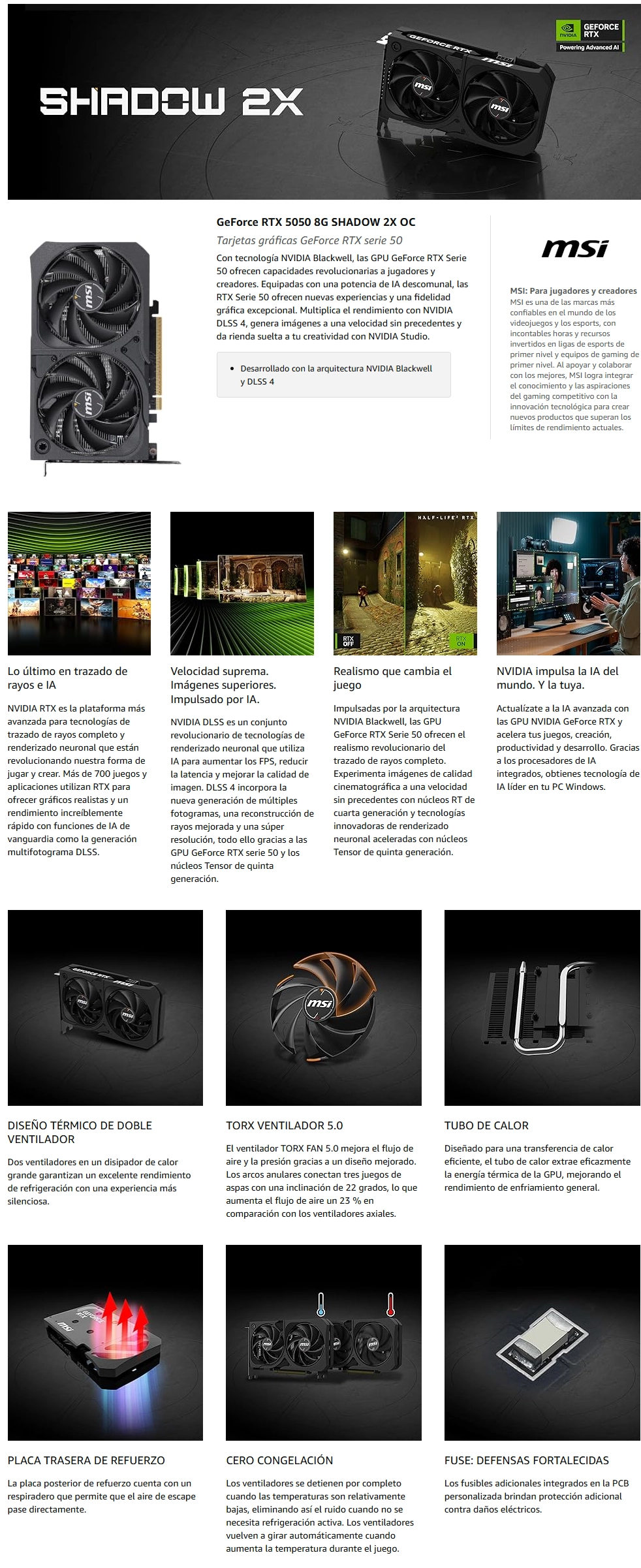 - Tarjeta Grafica Msi Geforce Rtx 5050 8Gb Gddr6 (Rtx 5050 8G Shadow 2X Oc) 128 Bit, Pcie 5.0, Arquitectura Nvidia Blackwell