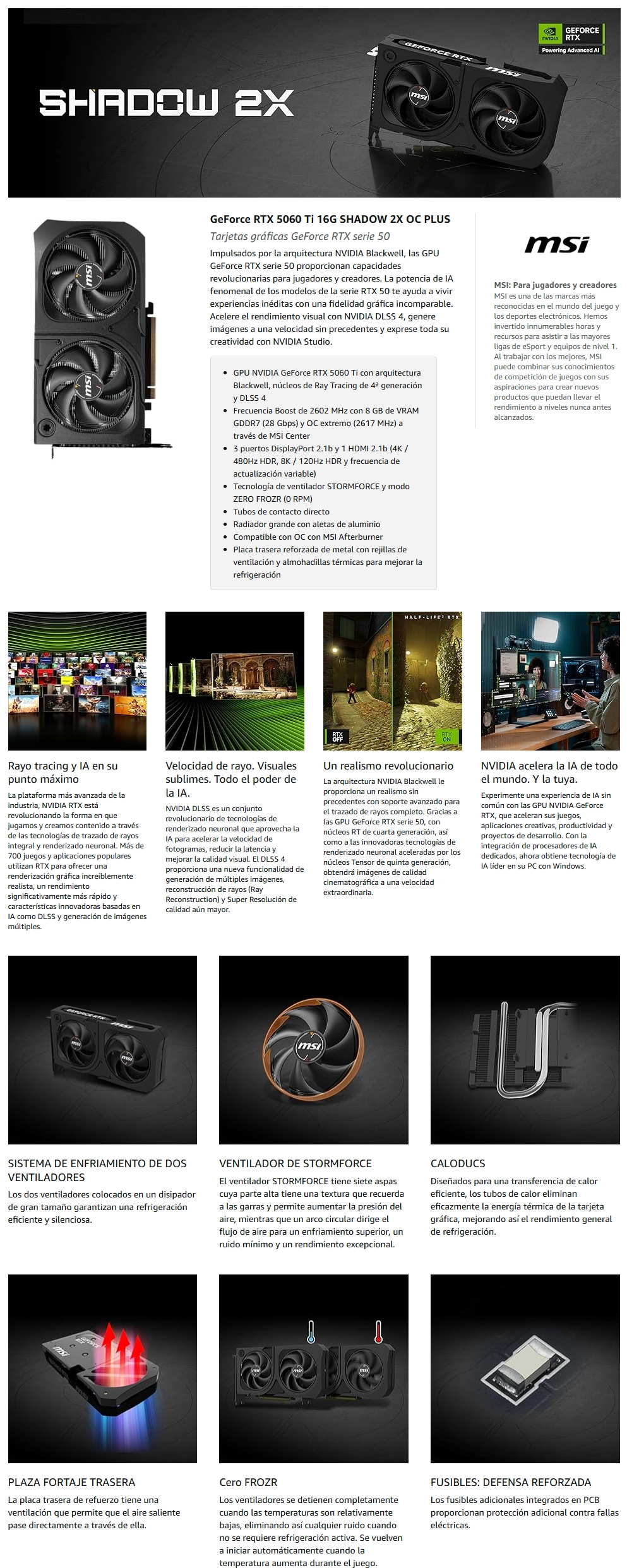 - Tarjeta Grafica Msi Geforce Rtx 5060Ti 8Gb Gddr7 (Rtx 5060 Ti 8G Shadow 2X Oc Plus) 128 Bit, Dlss 4