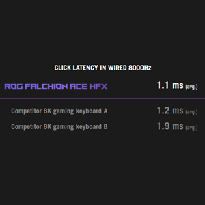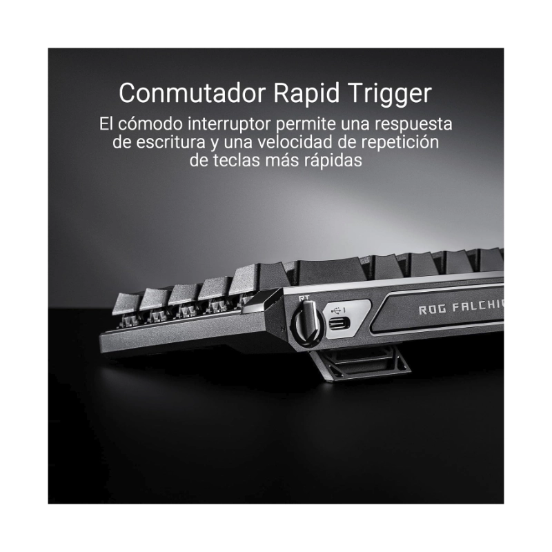 ROG Falchion Ace HFXTeclado gaming analógico ROG Falchion Ace HFX 65% con interruptores magnéticos ROG HFX prelubricados, conmutador de disparo rápido, modo Speed Tap, panel táctil interactivo, frecuencia de sondeo de 8000 Hz, amortiguación de cinco capas y soporte con junta de silicona, puertos Type-C duales, tres ángulos de inclinación y funda protectora