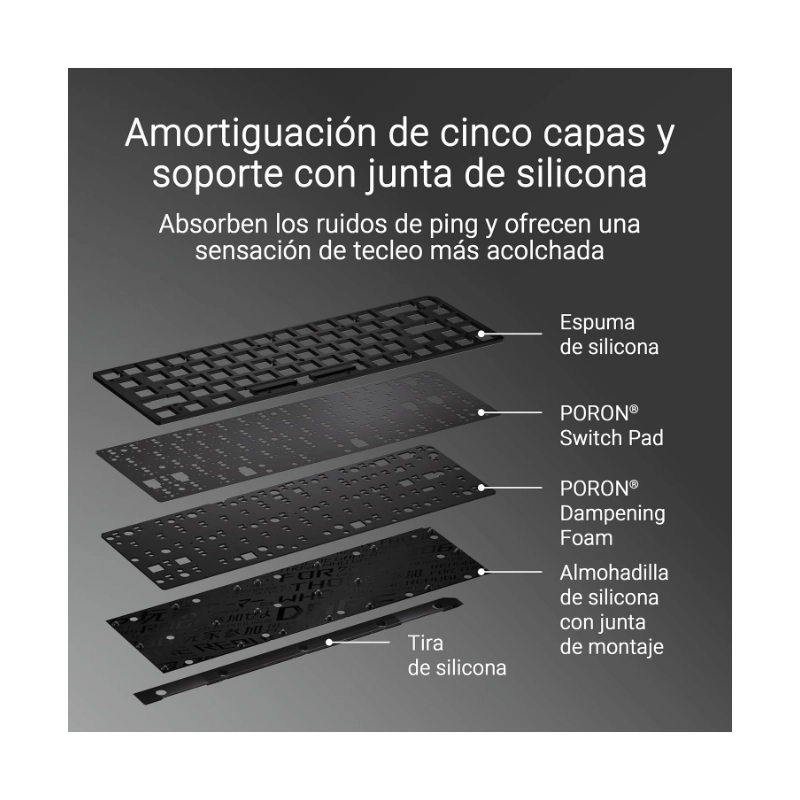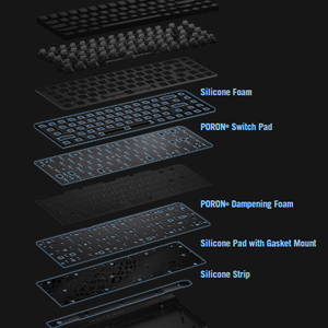 Amortiguación de cinco capas y montaje con juntaEl Falchion Ace HFX utiliza cinco capas amortiguadoras -dos de PORON y tres de silicona- para absorber las vibraciones de las pulsaciones y el ruido de ping, proporcionando una experiencia de tecleo amortiguada superior. |