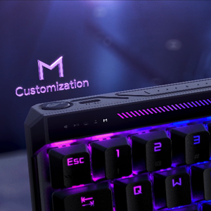 Controles intuitivosUn botón multifunción y un panel táctil interactivo te permiten modificar diversos ajustes, como el volumen, la reproducción multimedia, la iluminación del teclado y el punto de actuación, así como personalizar los comandos. Además, la barra de iluminación LED de la parte superior del teclado muestra efectos de iluminación dinámicos para reflejar los ajustes en tiempo real. |