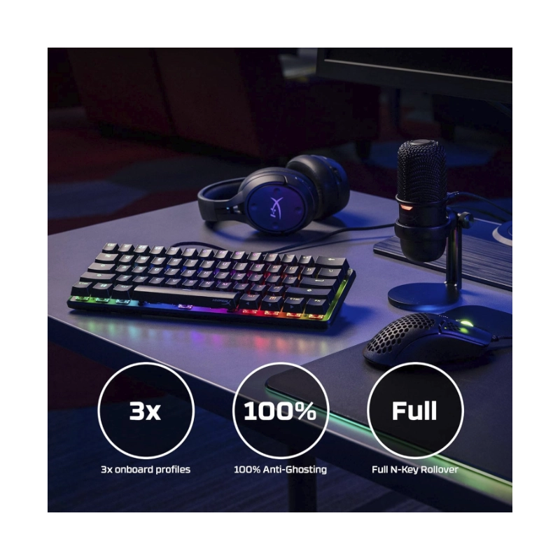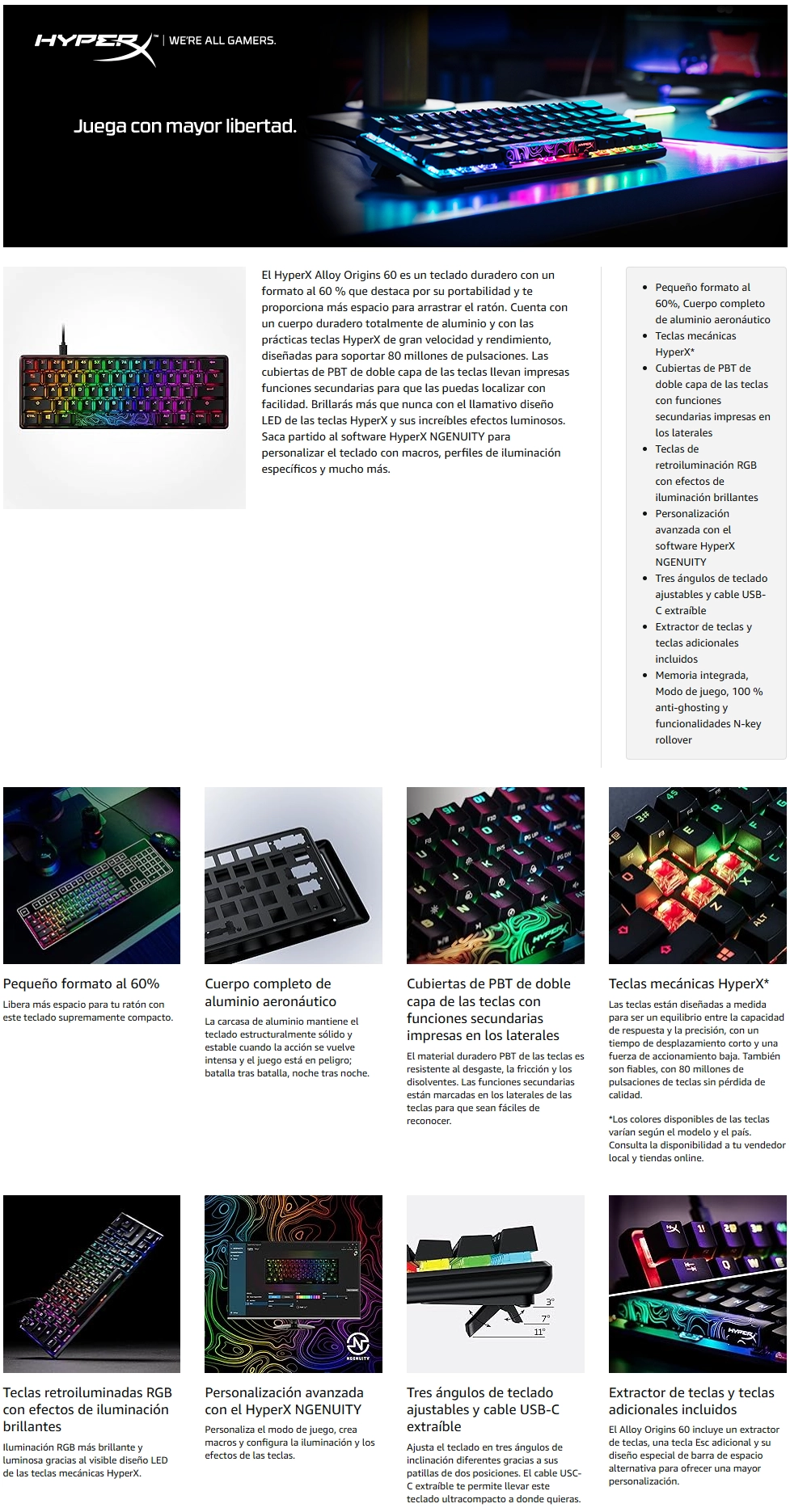 - Teclado Hyperx Alloy Origins 60 (4P5N4Aa#Aba) Gaming, Negro, Mecanico, Switch Rojo Lineal, Cubiertas De Pbt Doble Capa De Las Teclas, Led-Rgb