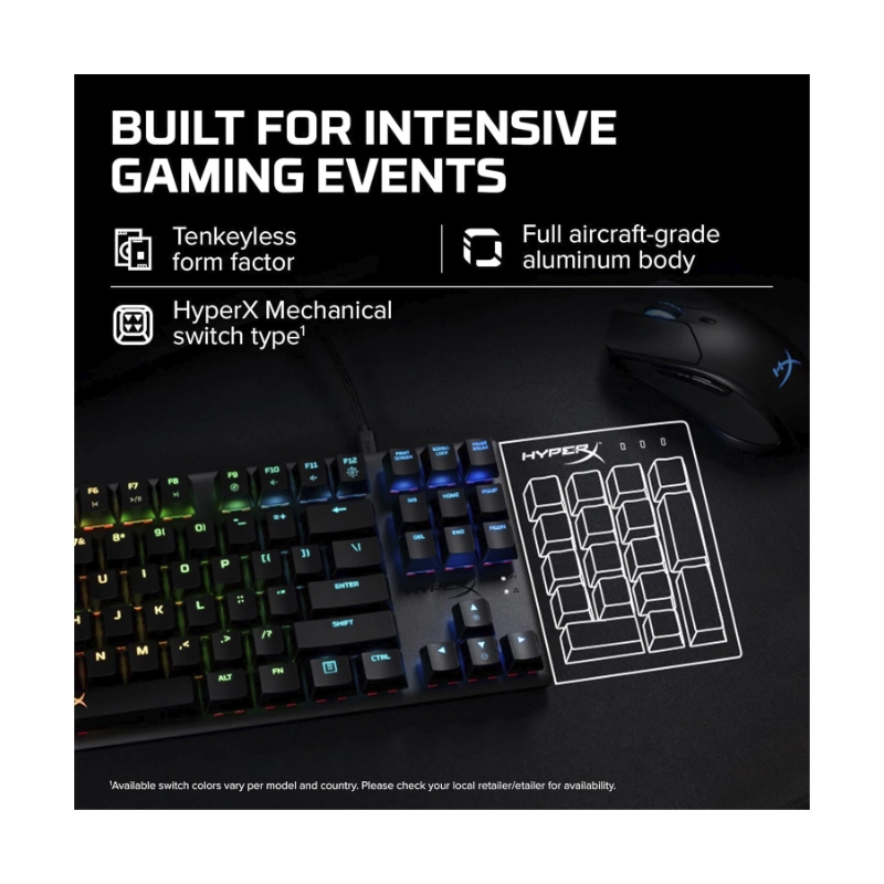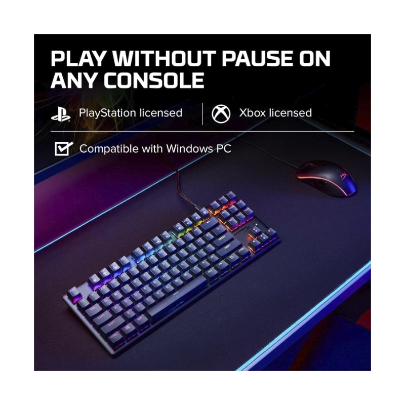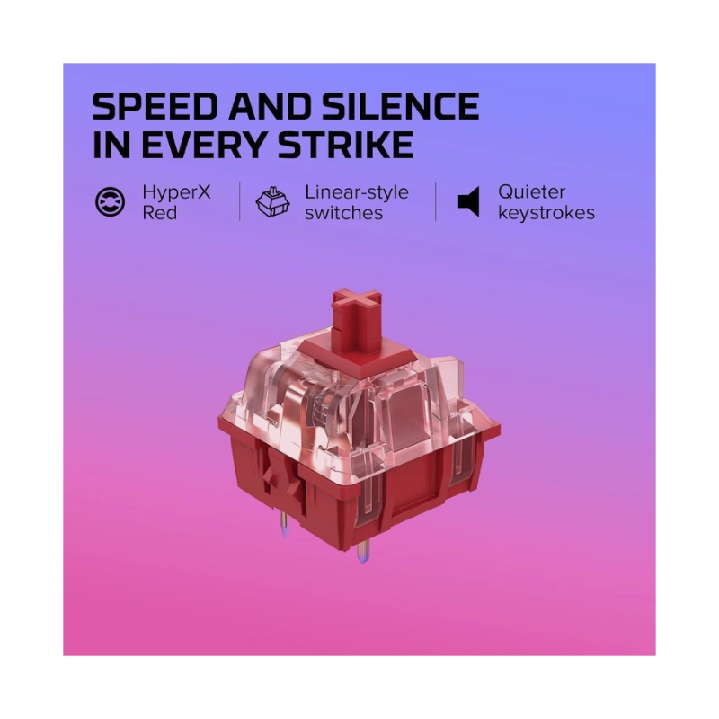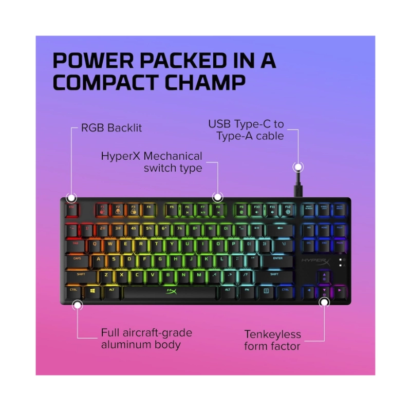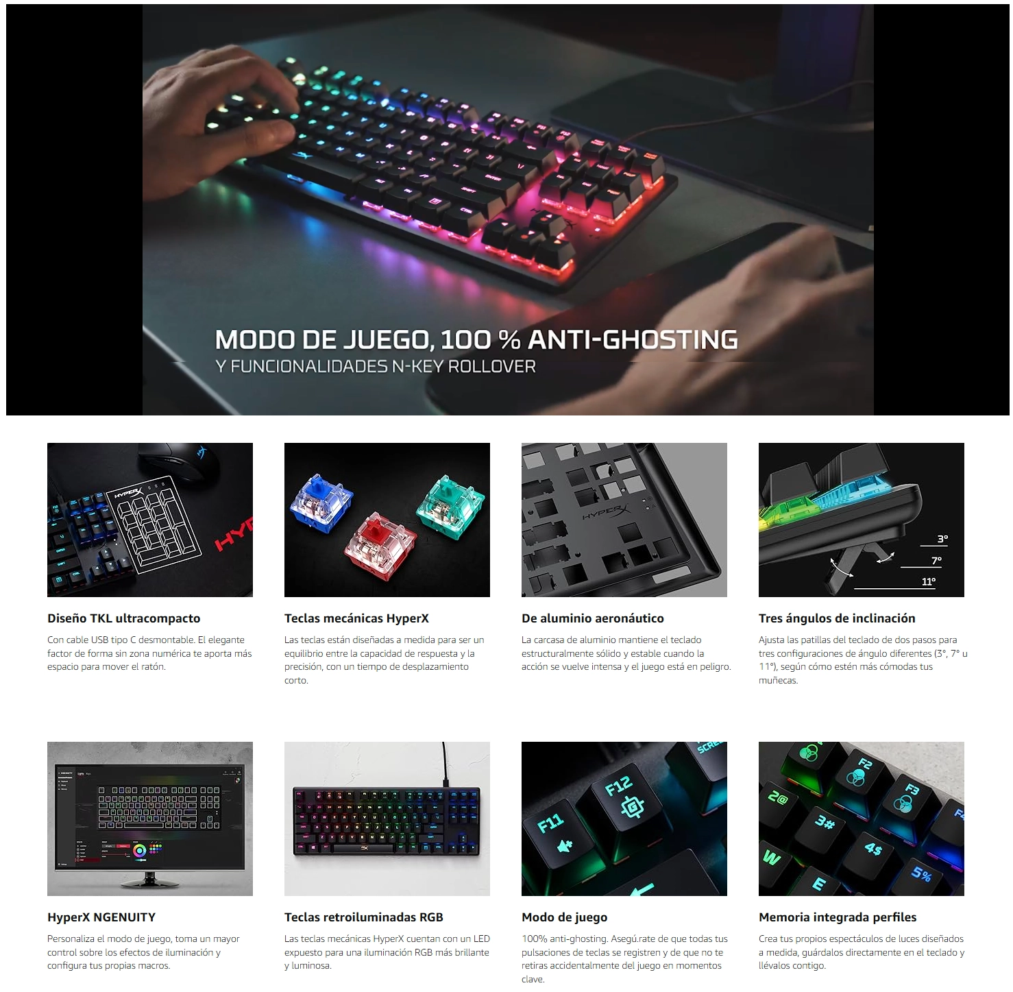 | Detalles | Interruptores (Switches): HyperX Red (mecánicos lineales). Diseño de Teclas: Distribución en Inglés (EE. UU.). Iluminación: RGB personalizable por tecla con efectos dinámicos mediante el software HyperX NGENUITY. Construcción: Cuerpo completo de aluminio de grado aeronáutico para mayor estabilidad. Conectividad: Cable USB-C a USB-A trenzado y desmontable. Compatibilidad: Funciona con PC, PS5, PS4, Xbox Series X|S y Xbox One. Funciones Adicionales: 100% Anti-ghosting, modo de juego y memoria integrada para 3 perfiles. |