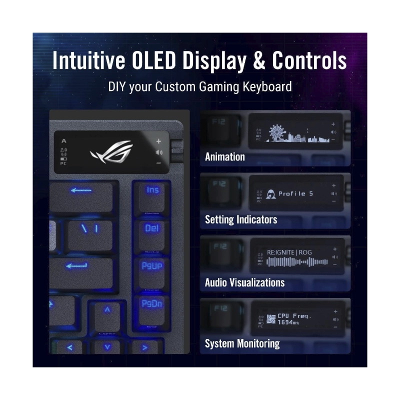 PANTALLA OLED Y PERILLA DE CONTROL DE TRES VÍASEl panel OLED muestra el estado del teclado, indicadores de configuración, información multimedia, animaciones personalizadas y parámetros del sistema. Los ajustes se realizan mediante el mando giratorio de tres direcciones y el botón lateral. |