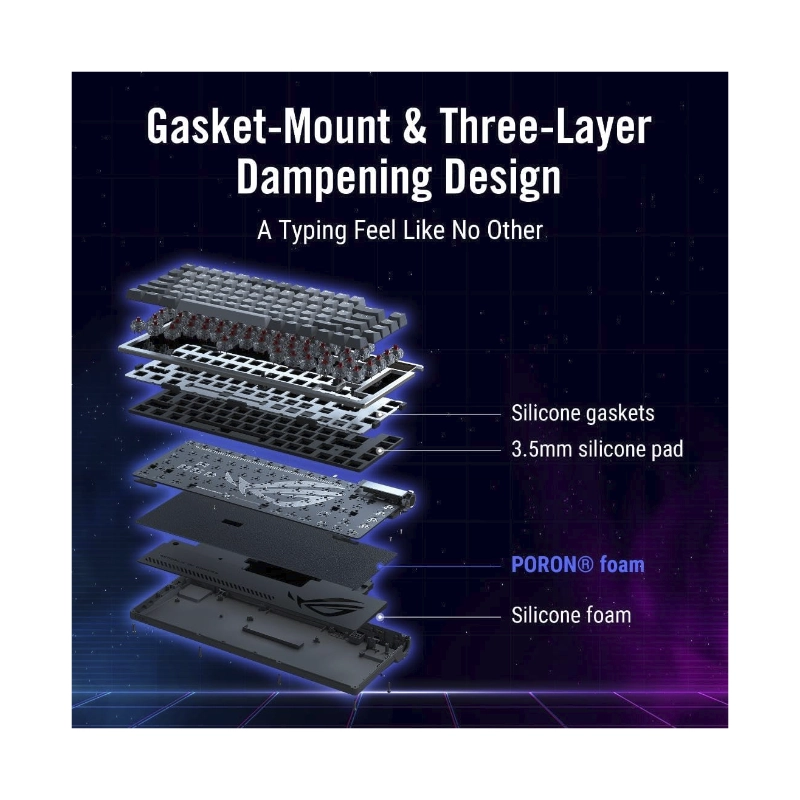 TRASCENDER LOS LÍMITESEl teclado inalámbrico para juegos ASUS ROG Azoth 75 cuenta con un diseño de montaje con junta y amortiguación de tres capas, interruptores mecánicos ROG NX prelubricados e intercambiables en caliente, estabilizadores de teclado ROG, teclas PBT de doble inyección y kit de lubricación de interruptores, pantalla OLED y conexión trimodal con tecnología inalámbrica SpeedNova. |