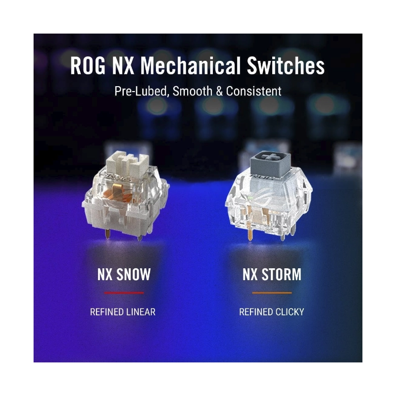 ROG NX Storm: Clicky refinadoSe realiza un ajuste especial, junto con una lubricación previa de fábrica, para dotar a la pulsación de las teclas del ROG NX Storm de un sonido muy nítido y con clic, con una acústica «clac». |
