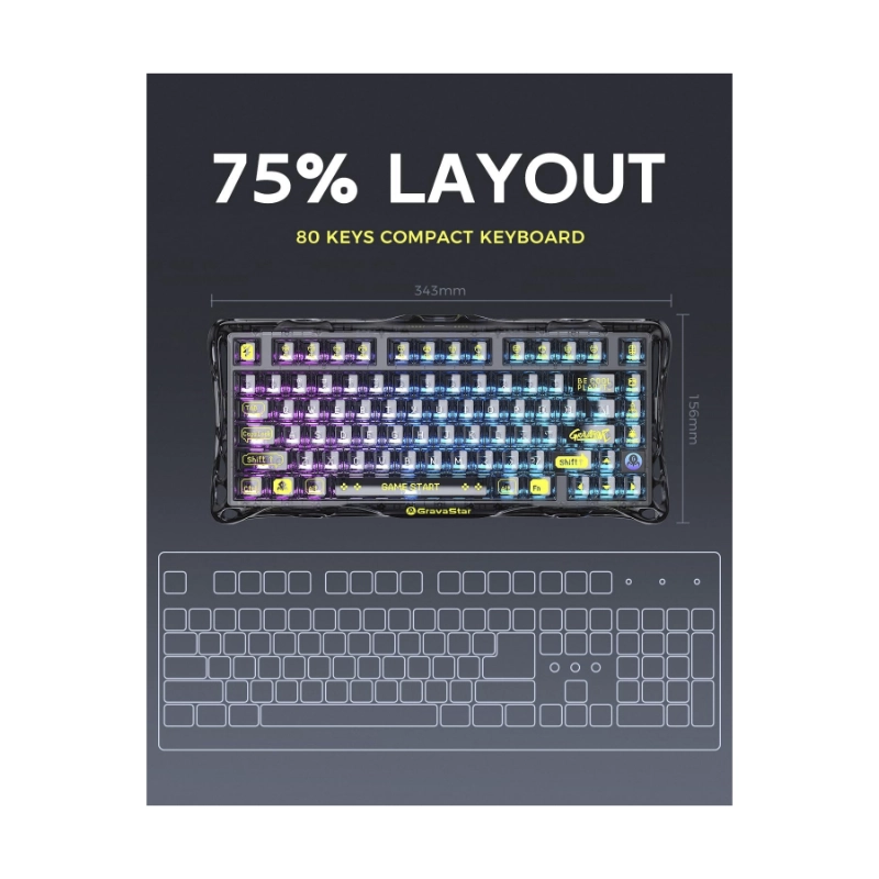 - Teclado Inalambrico Gravastar Mercury K1 Lite 75% (Gs K1 Lite-Xtal-Blk) Negro, Mecanico, Bluetooth, Switch Lineales Prelubricados, Rgb Transparente