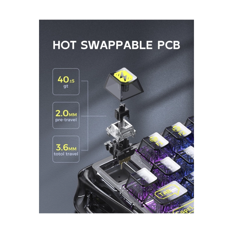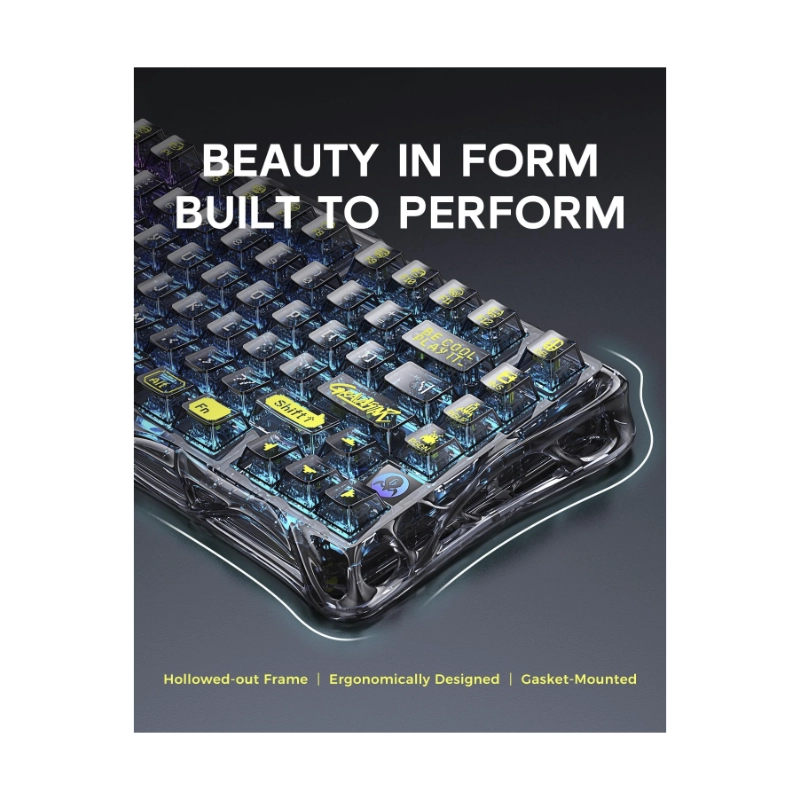 Teclado Inalambrico Gravastar Mercury K1 Lite 75% (Gs K1 Lite-Xtal-Blk) Negro, Mecanico, Bluetooth, Switch Lineales Prelubricados, Rgb Transparente