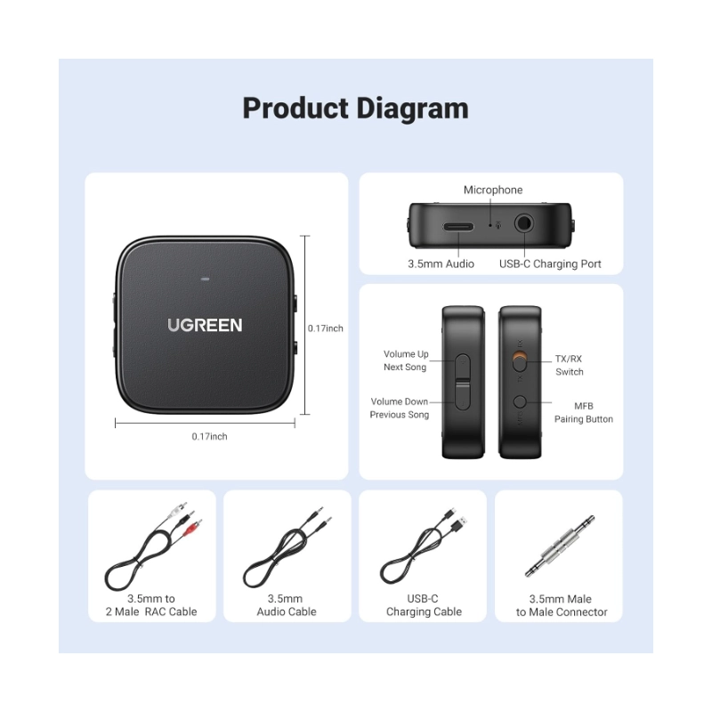 - Transmisor Receptor Bluetooth Ugreen (35223) Bt 5.2, Adaptador Aux Jack 3.5Mm Y Rca, Audio Inalambrico Con Microfono, Pc Altavoz Amplificador