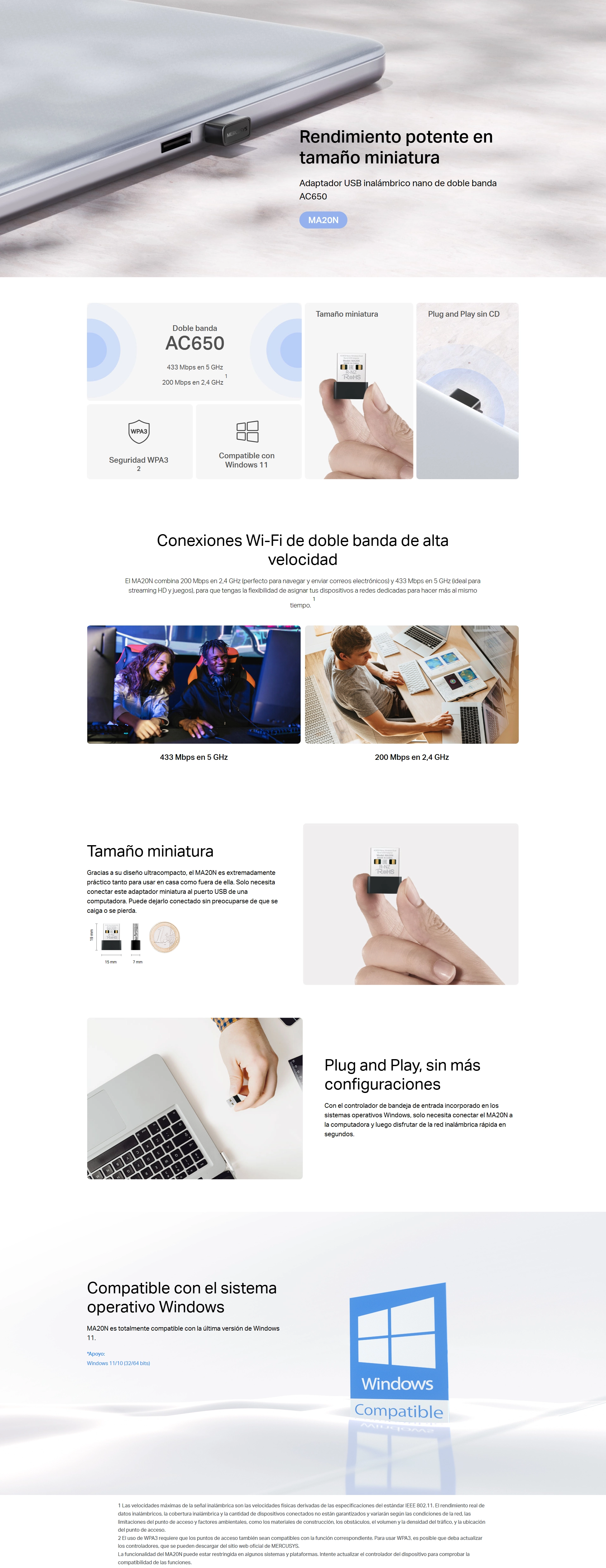 | Otros | * Contenido del paquete: Adaptador USB inalámbrico nano de doble banda AC650 (MA20N) Guía de instalación rápida: * Requisitos del sistema: Windows 11/10 (32/64 bits) |