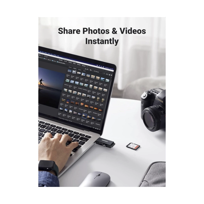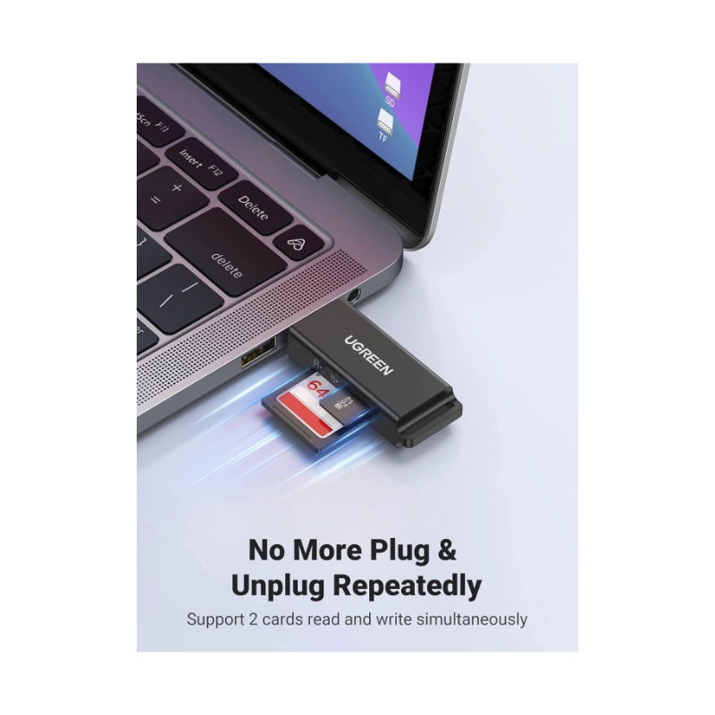 | Detalles | – Lector de tarjetas de memoria – SD / micro SD – USB 3.0 – Ugreen CM104 Un lector de tarjetas de memoria universal de la reconocida marca Ugreen es un accesorio que debes tener a tu disposición. Este dispositivo versátil tiene ranuras para formatos de tarjetas SD y TF . – Gracias al conector USB, podrás conectar fácilmente el lector al ordenador con la toma adecuada. No tiene que preocuparse por instalar ningún controlador. El equipo funciona en el estándar Plug & Play . Esto significa que se activa tan pronto como se inserta en la ranura. También es compatible con todos los sistemas operativos de computadora . – El cable USB 3.0 incorporado le permite transferir datos a una velocidad de hasta 95 MB/s . Sus pequeñas dimensiones y su forma ergonómica hacen que el lector de tarjetas Ugreen sea muy manejable. Además no ocupa mucho espacio en el escritorio y, si es necesario, puedes guardarlo en tu bolsillo y llevarlo contigo donde quieras. |