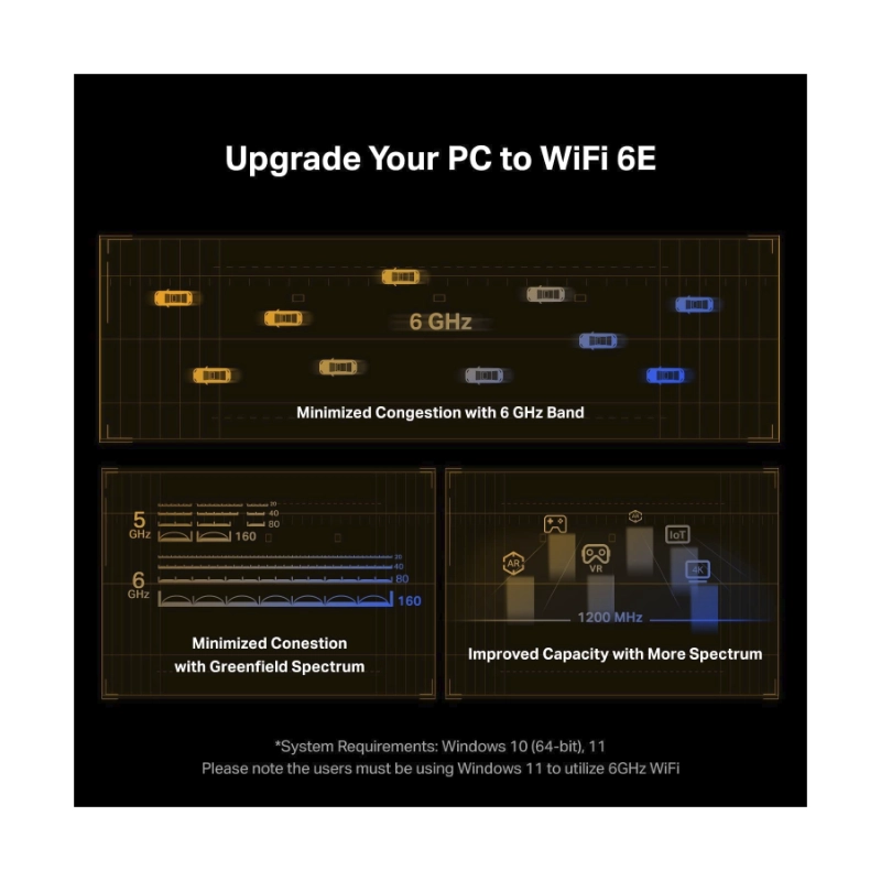Tribanda para una conexión ultrarrápidaLa tarjeta Wi-Fi PCIe con WiFi de tres bandas ofrece una mayor capacidad antiinterferente, una señal de red inalámbrica más estable y una velocidad de transmisión más rápida. |