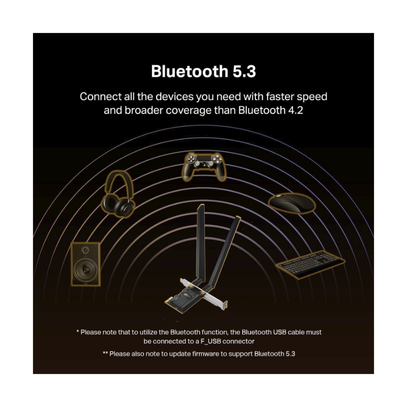 - Tarjeta Pcie Inalambrico + Bluetooth 5.3 Tp-Link Axe5400 (Archer Txe72E) Wi-Fi 6, 2.4Ghz/574Mbps, 5/6Ghz 2402Mbps, Antena X2, Wpa3, Latencia Ultrabaja